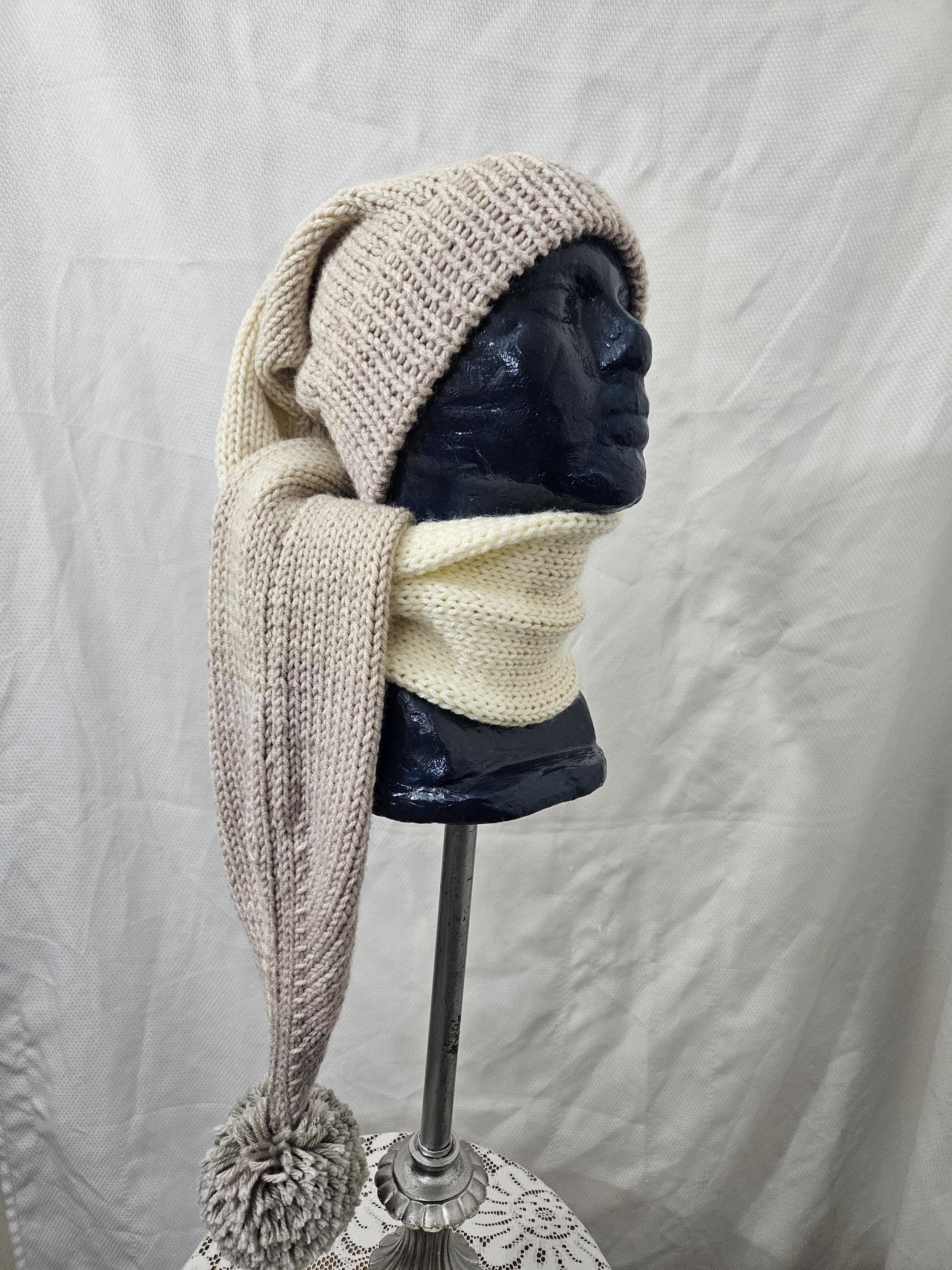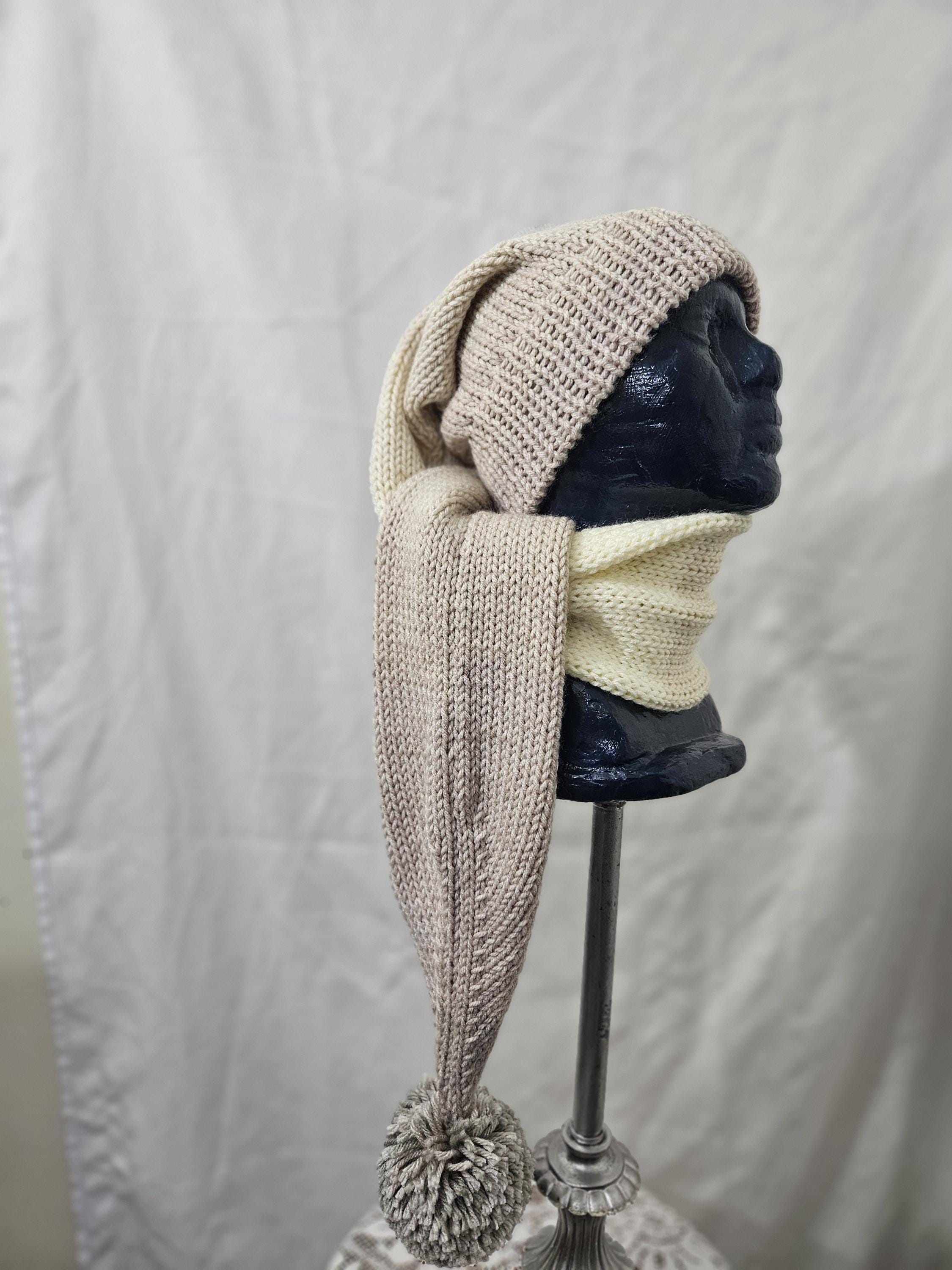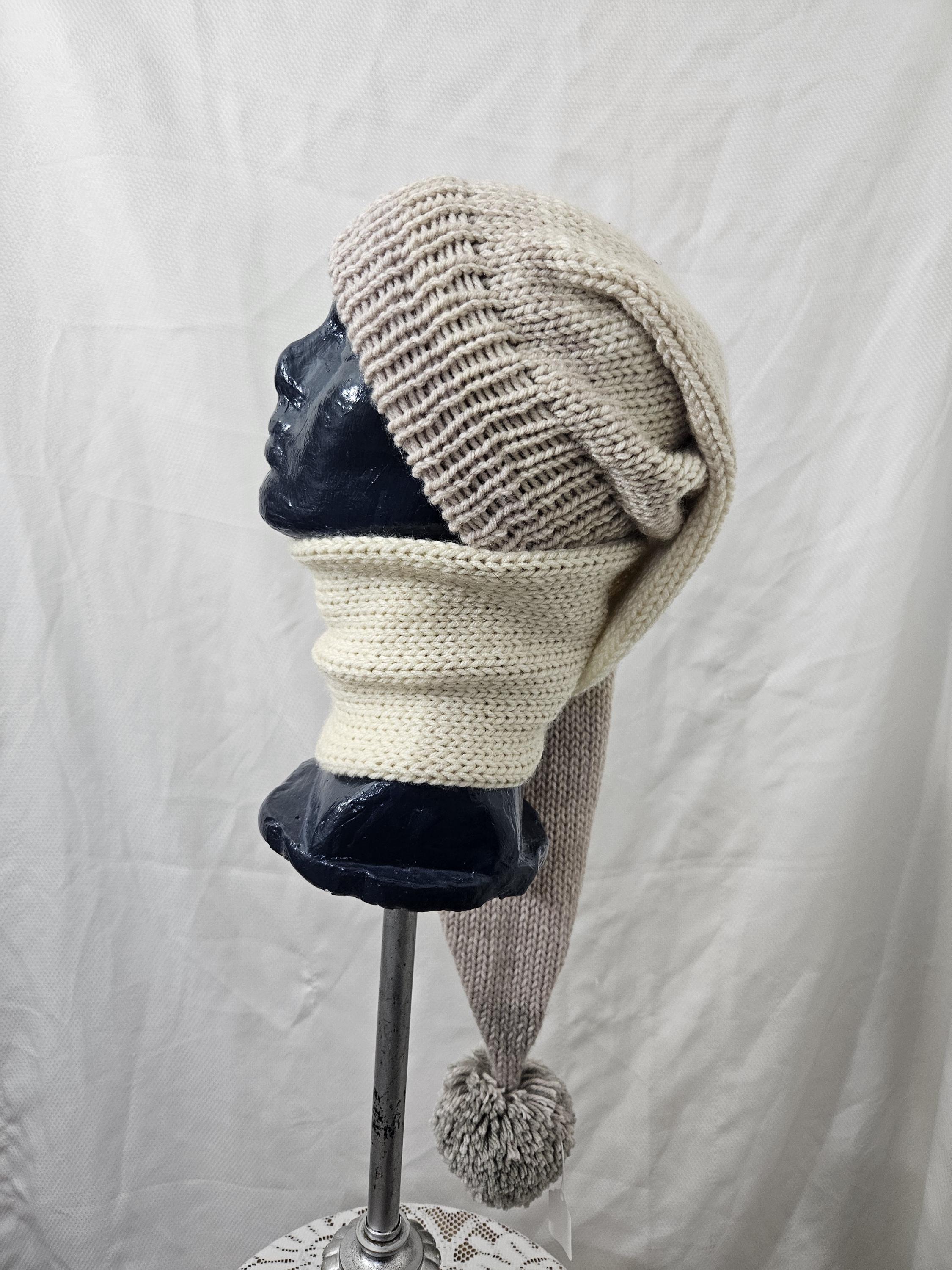 This is a pre-made long stocking hat made for man or woman. The Main color is Carrrara Marble (a mixture of light to dark tans)