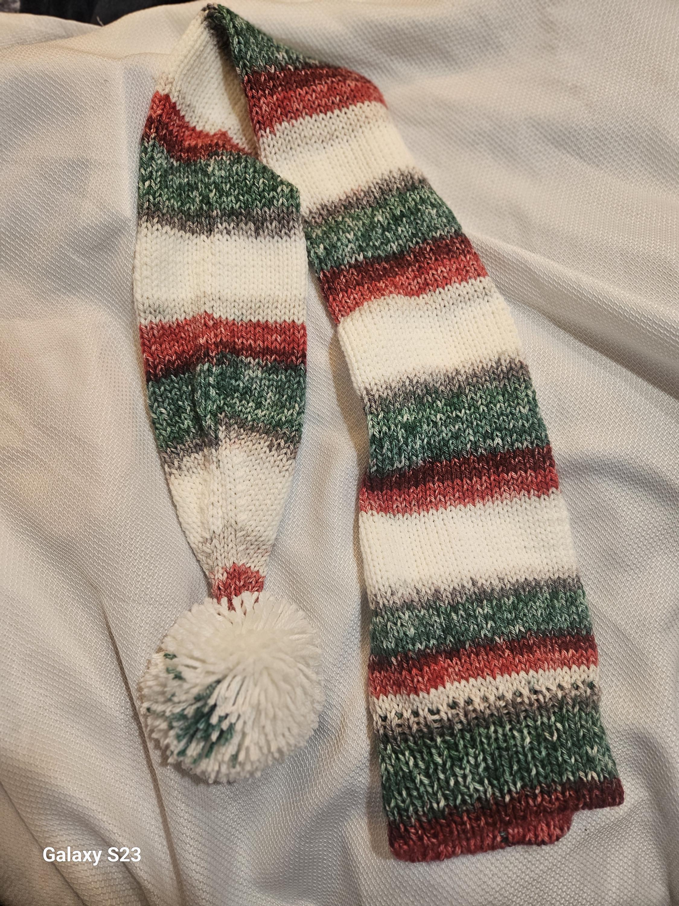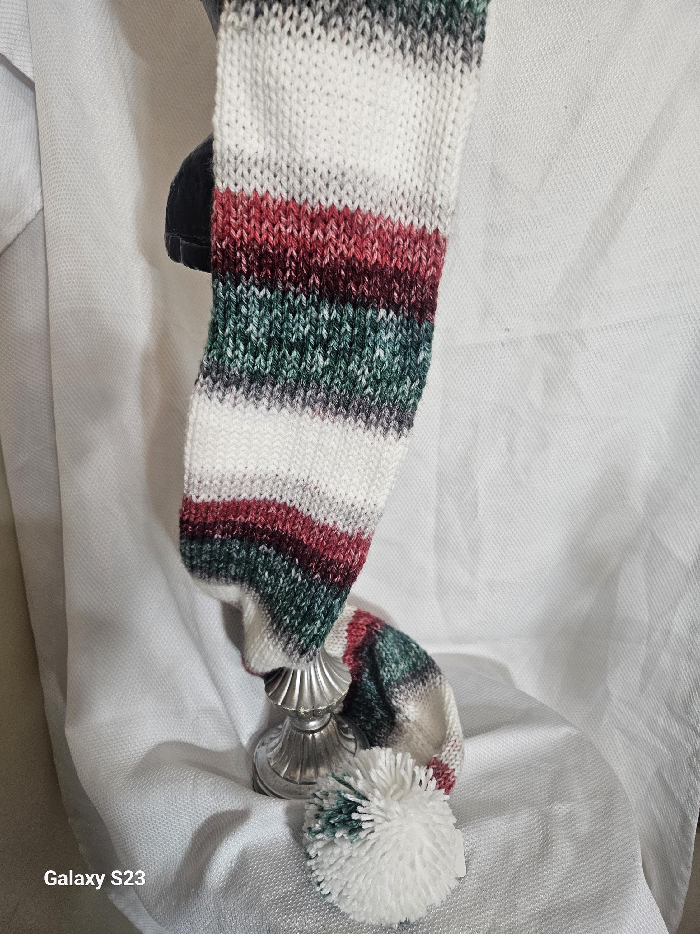The Color is Yuletide (Hunter green and Burgandy) and White length is 50" and matching Pom pom