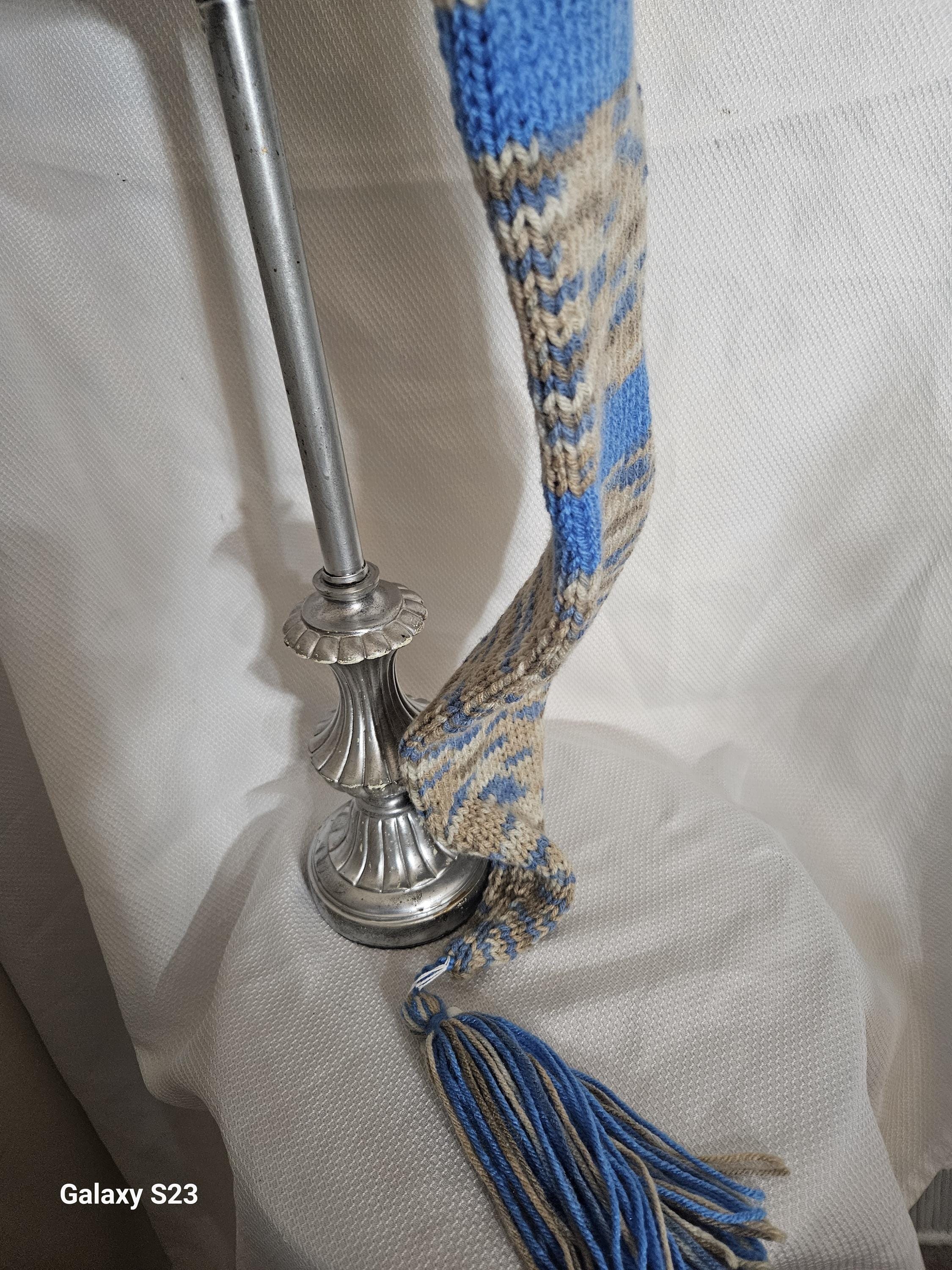 The Color is Deft Blue with Mirage (blue and tans) length is 45" and matching tassel