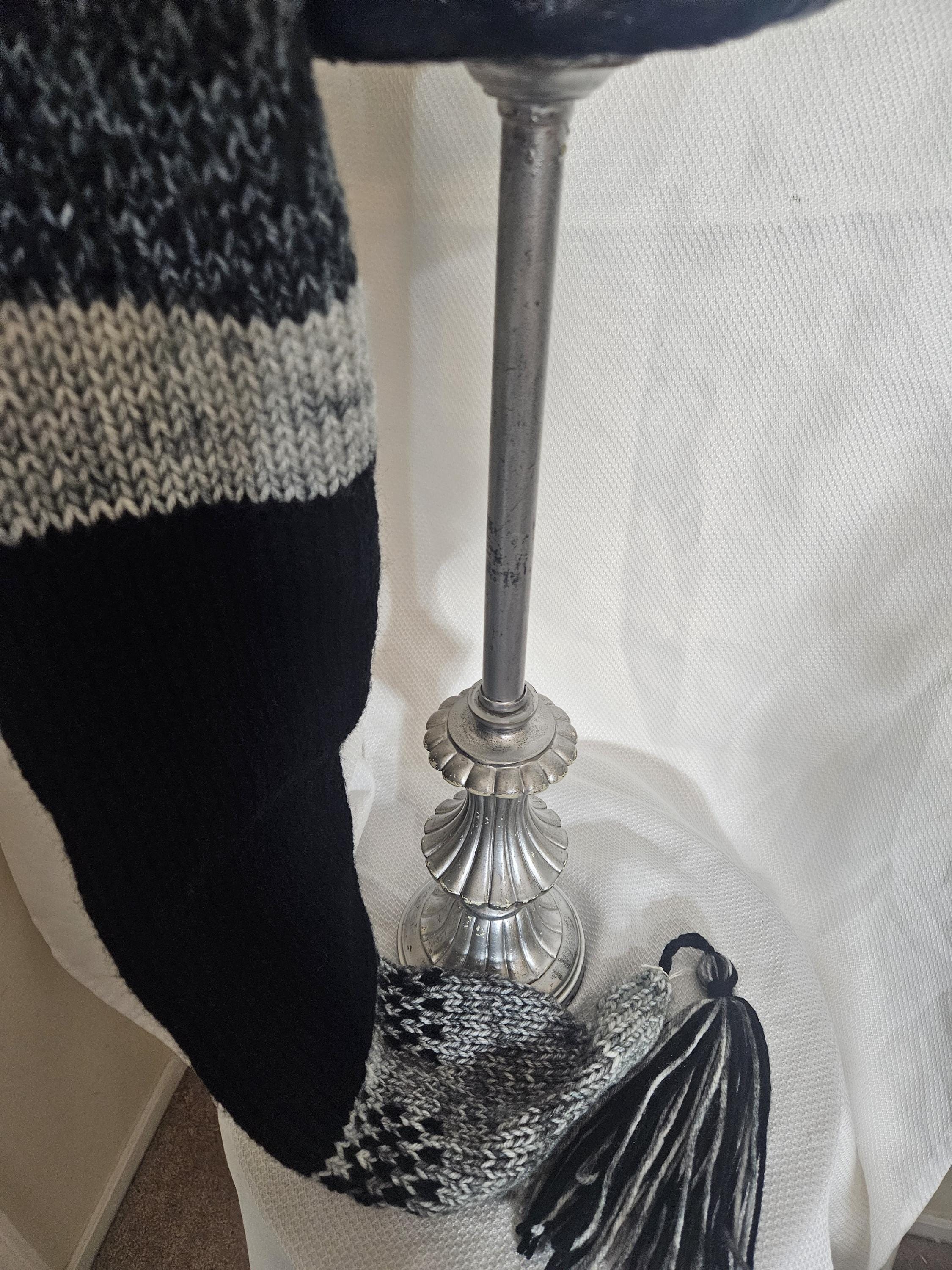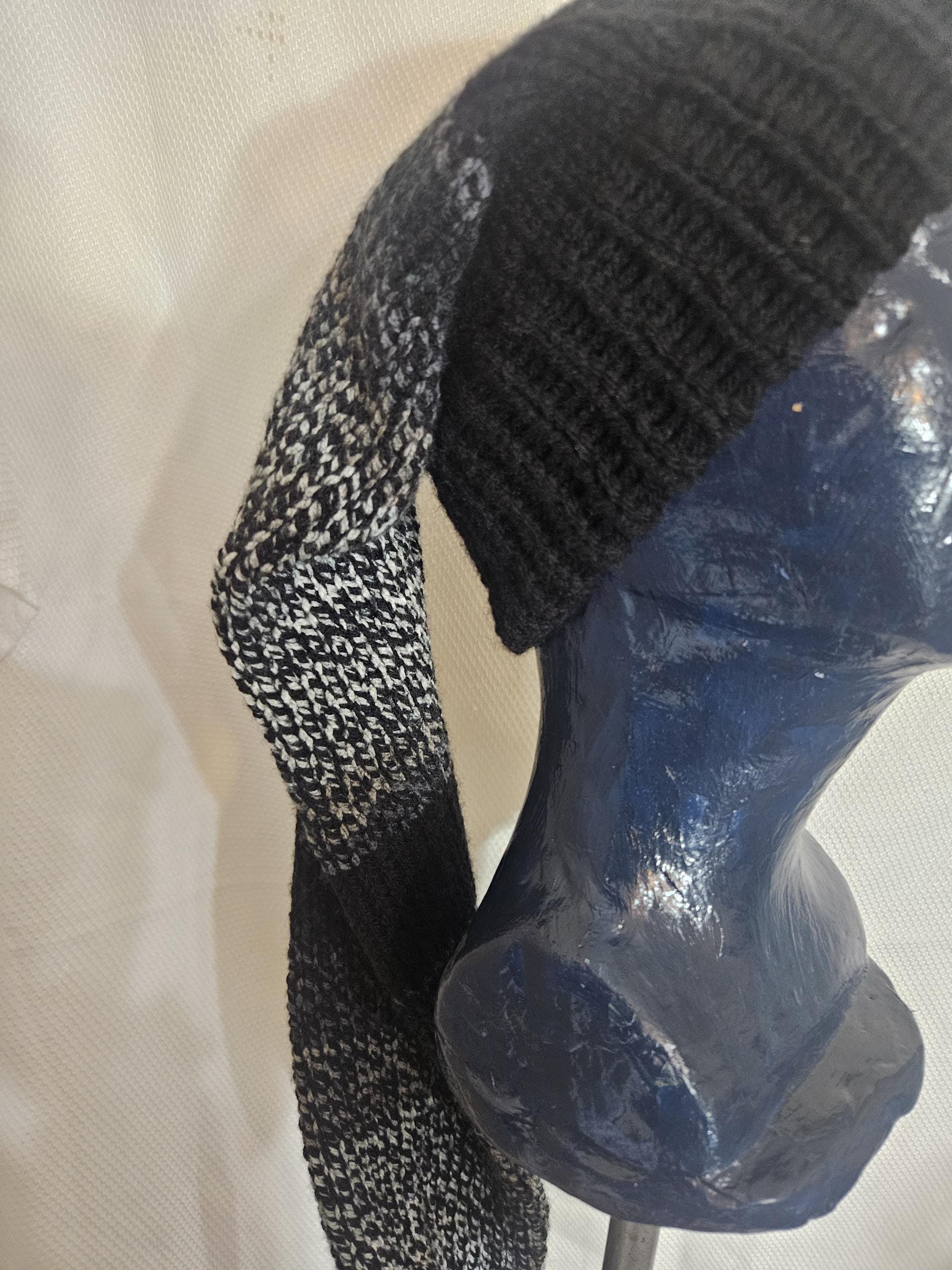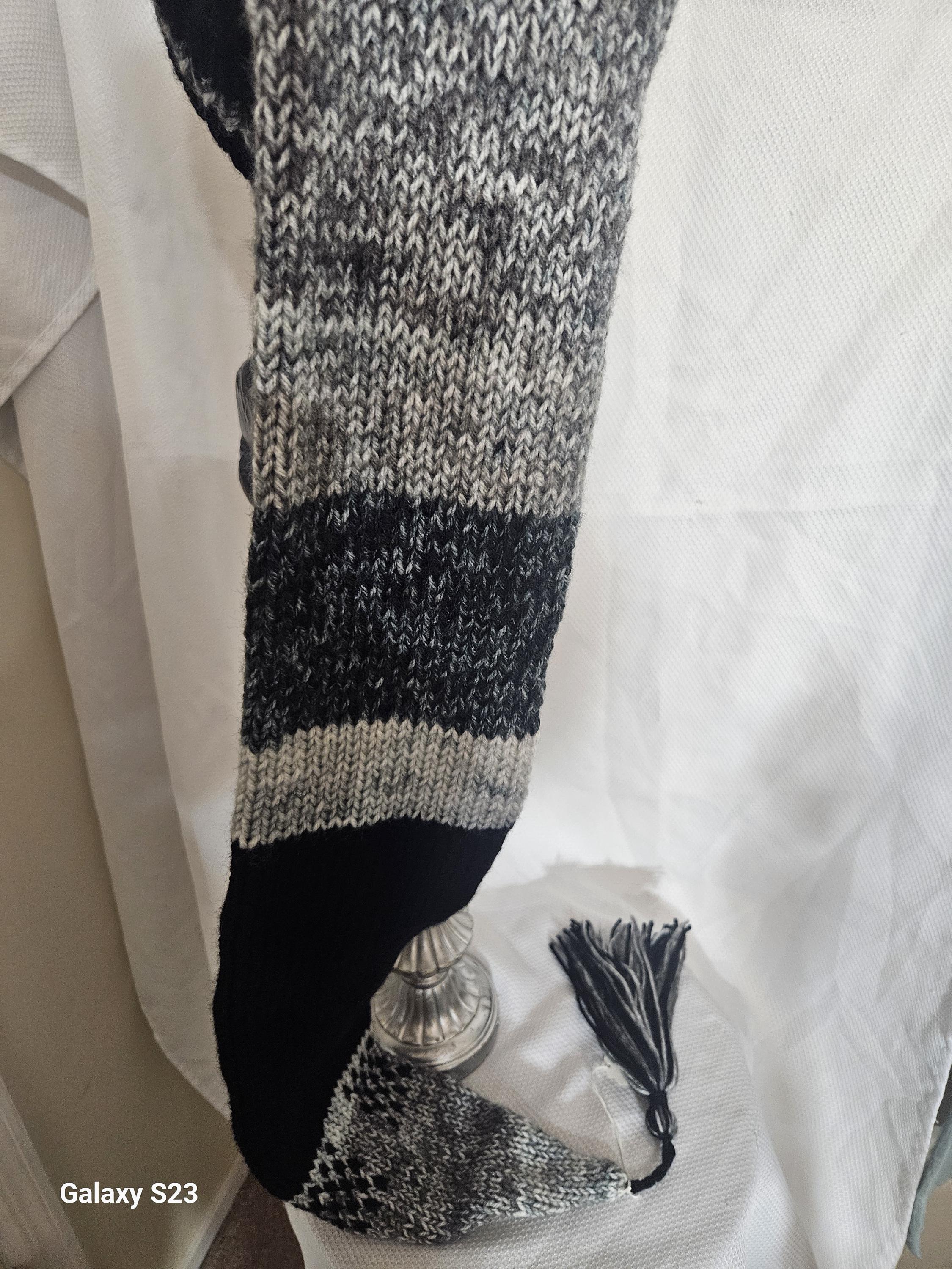 The Color is Black with Newsprint (grey, black, white), length is 45" and matching tassel A checkered design on hat and tail