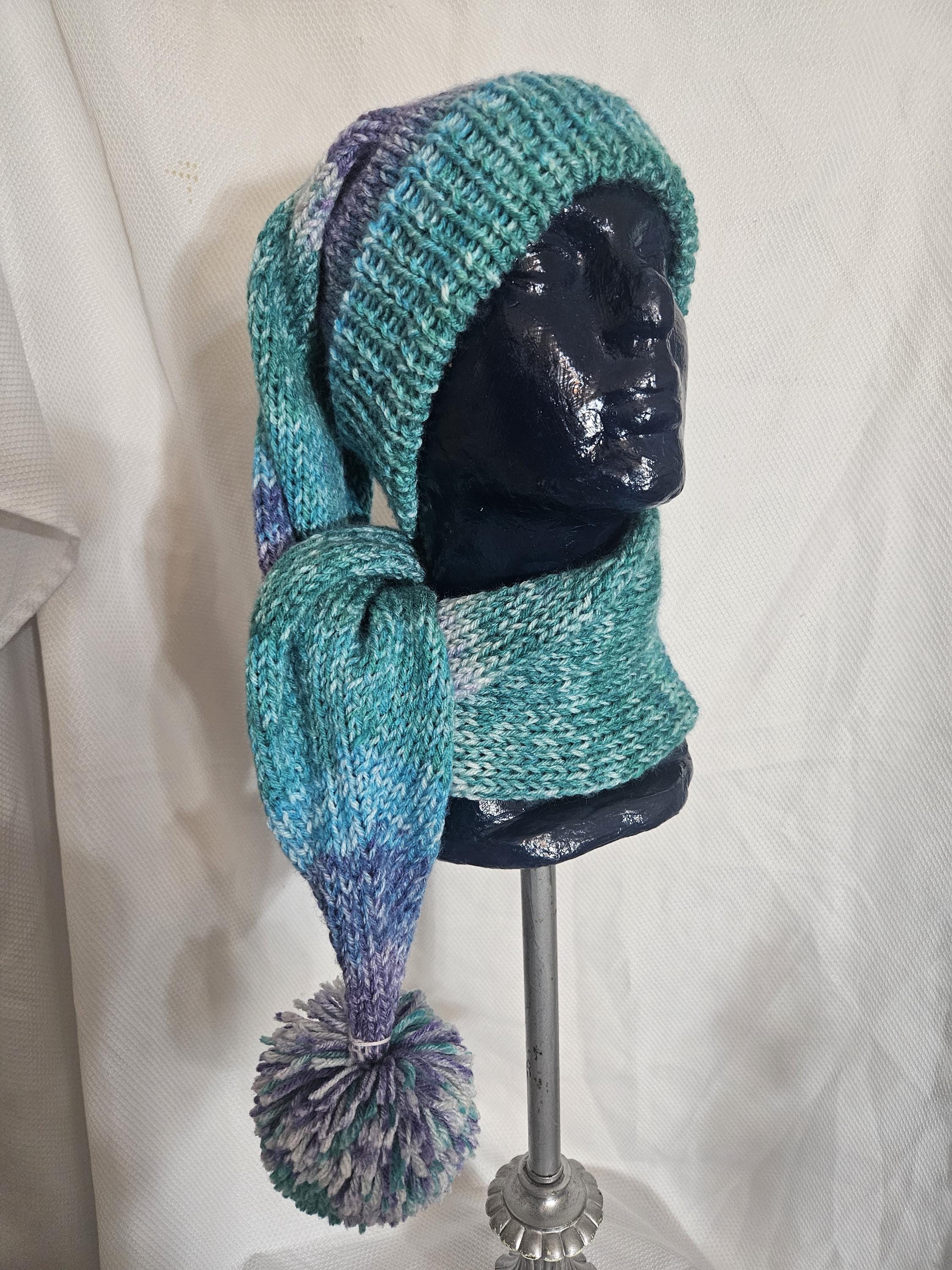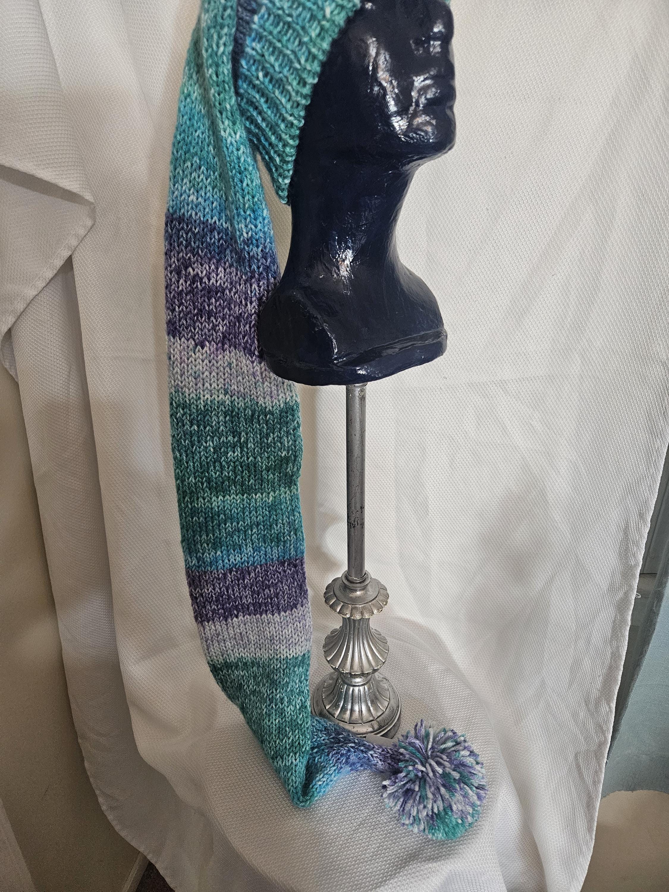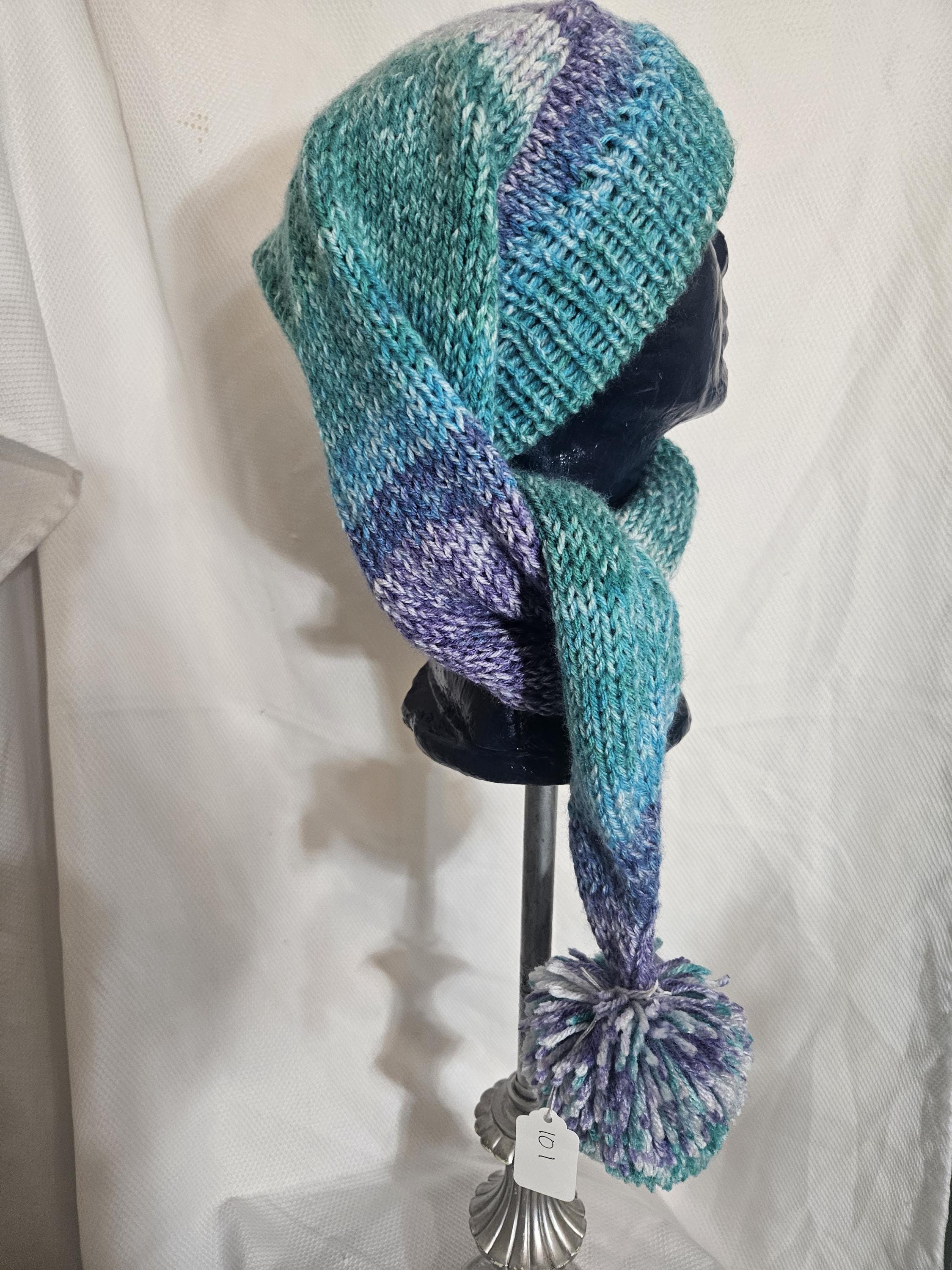 The color is Mermaid (aqua blue and purple) with a length of 45" and a matching pom pom.