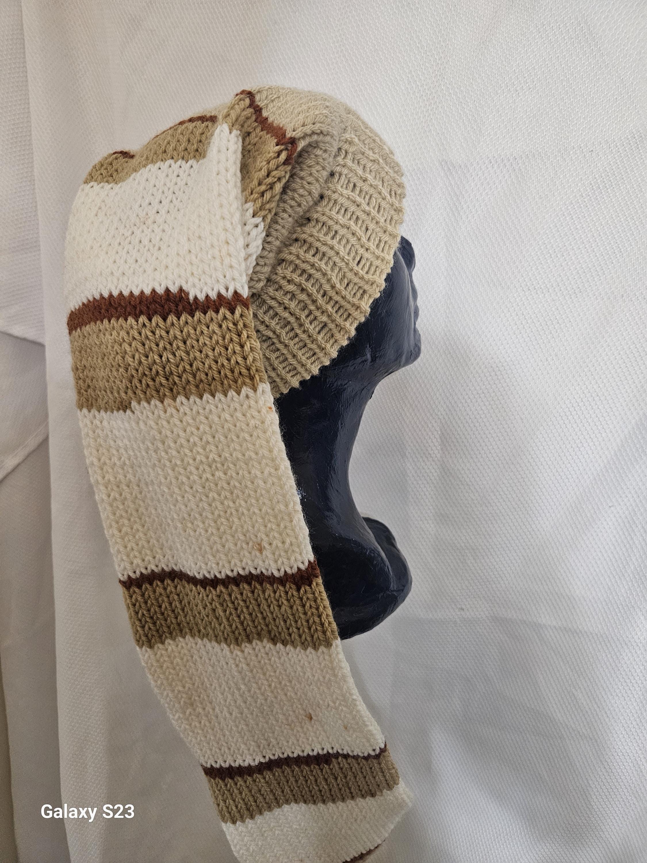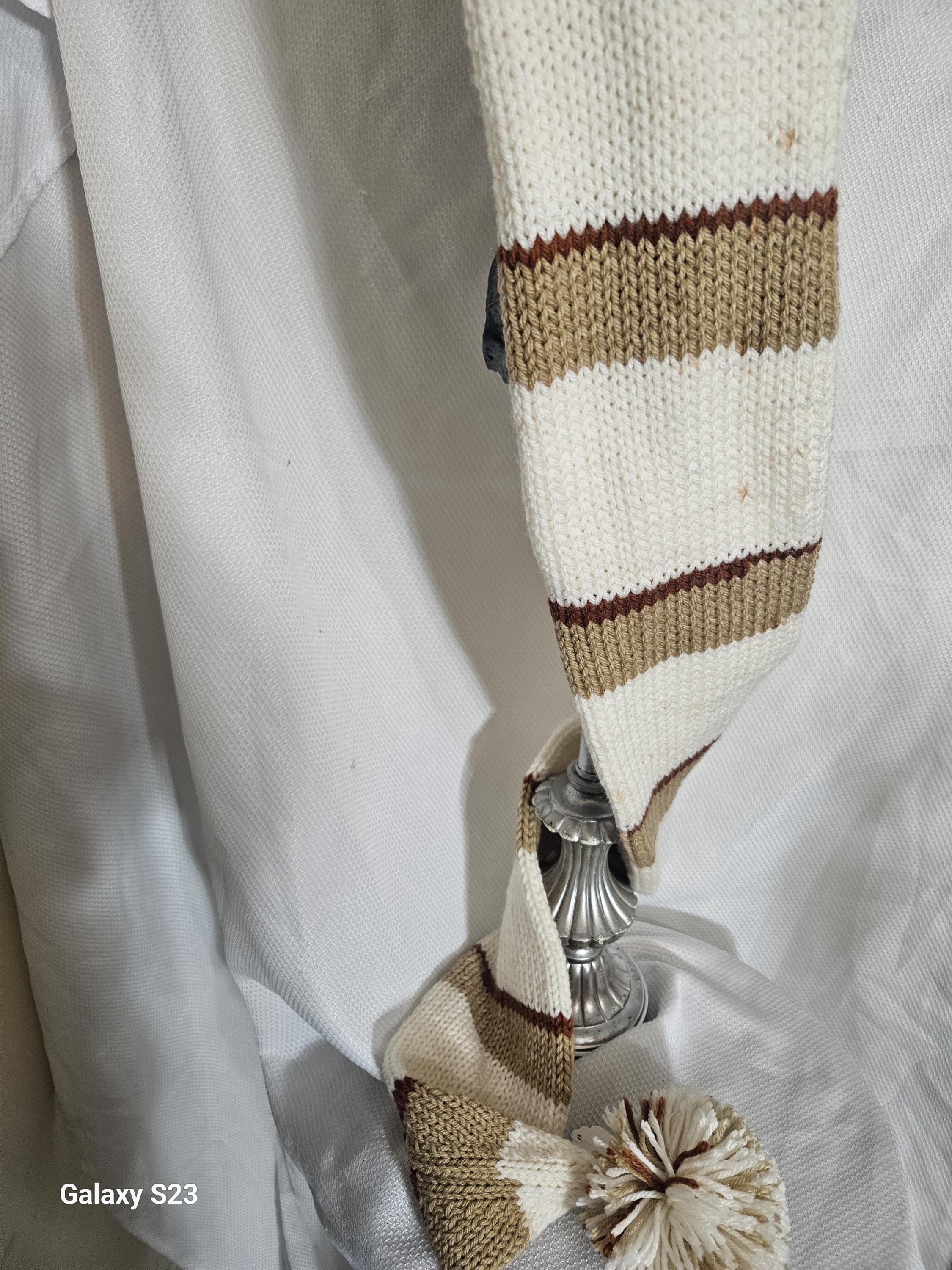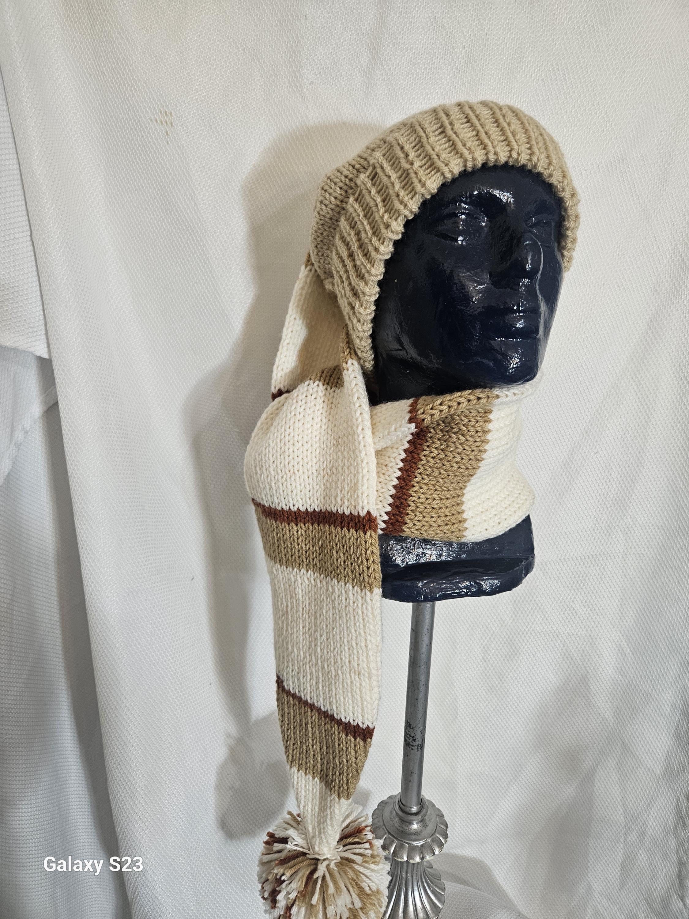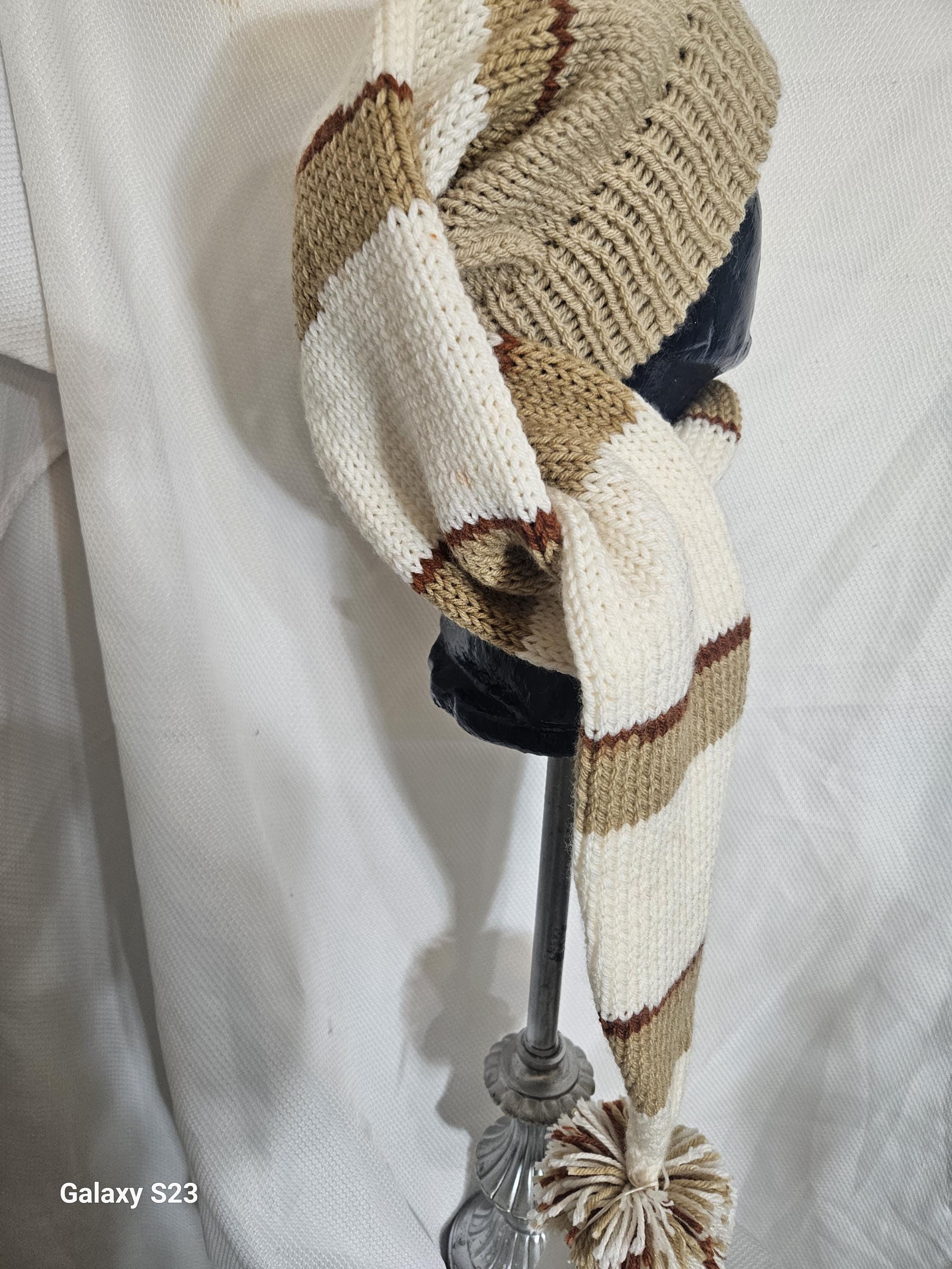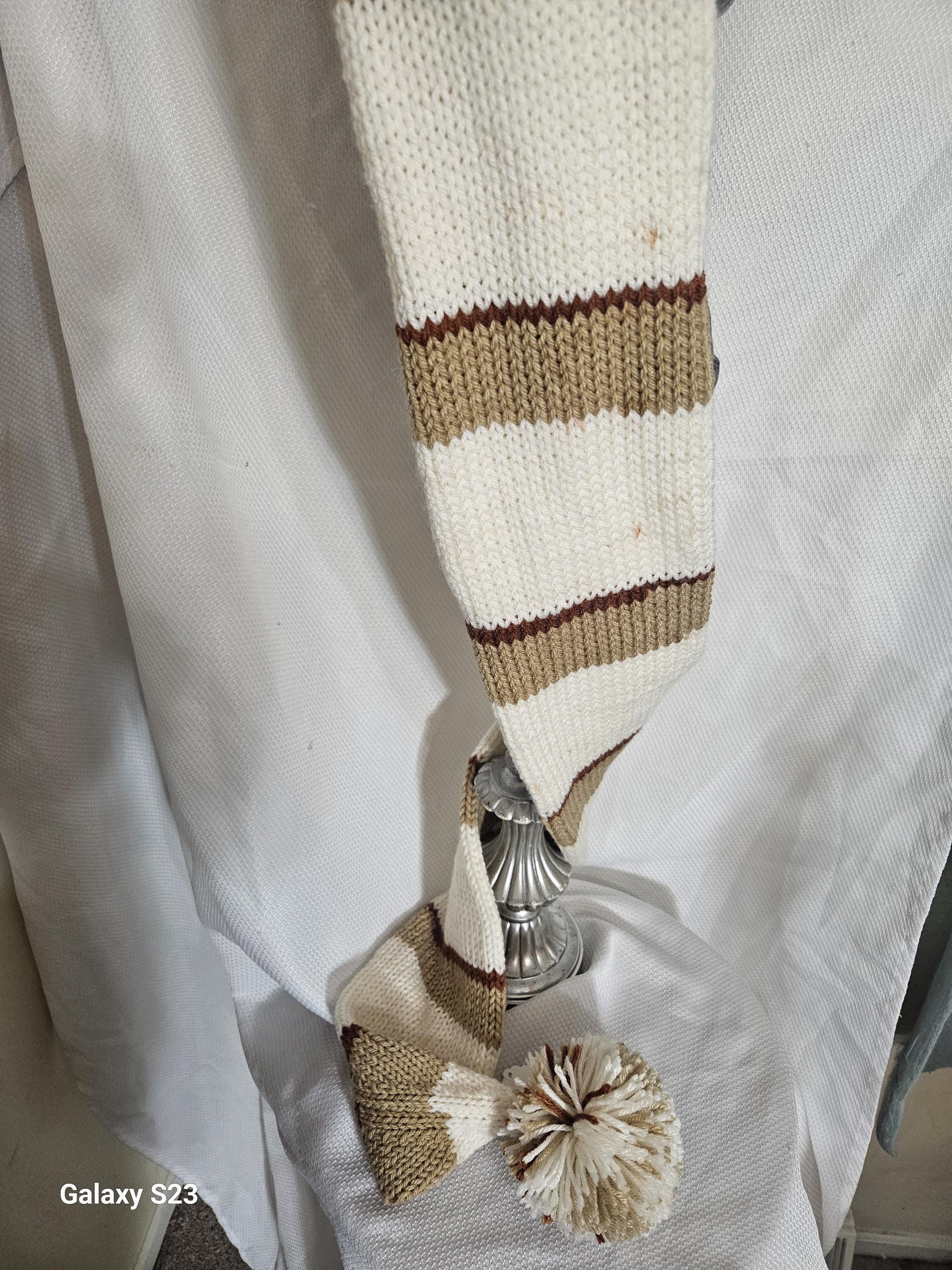 The Color is Buff and dried Bouguer (rust, beige and tan) length of 52" and matching pom pom