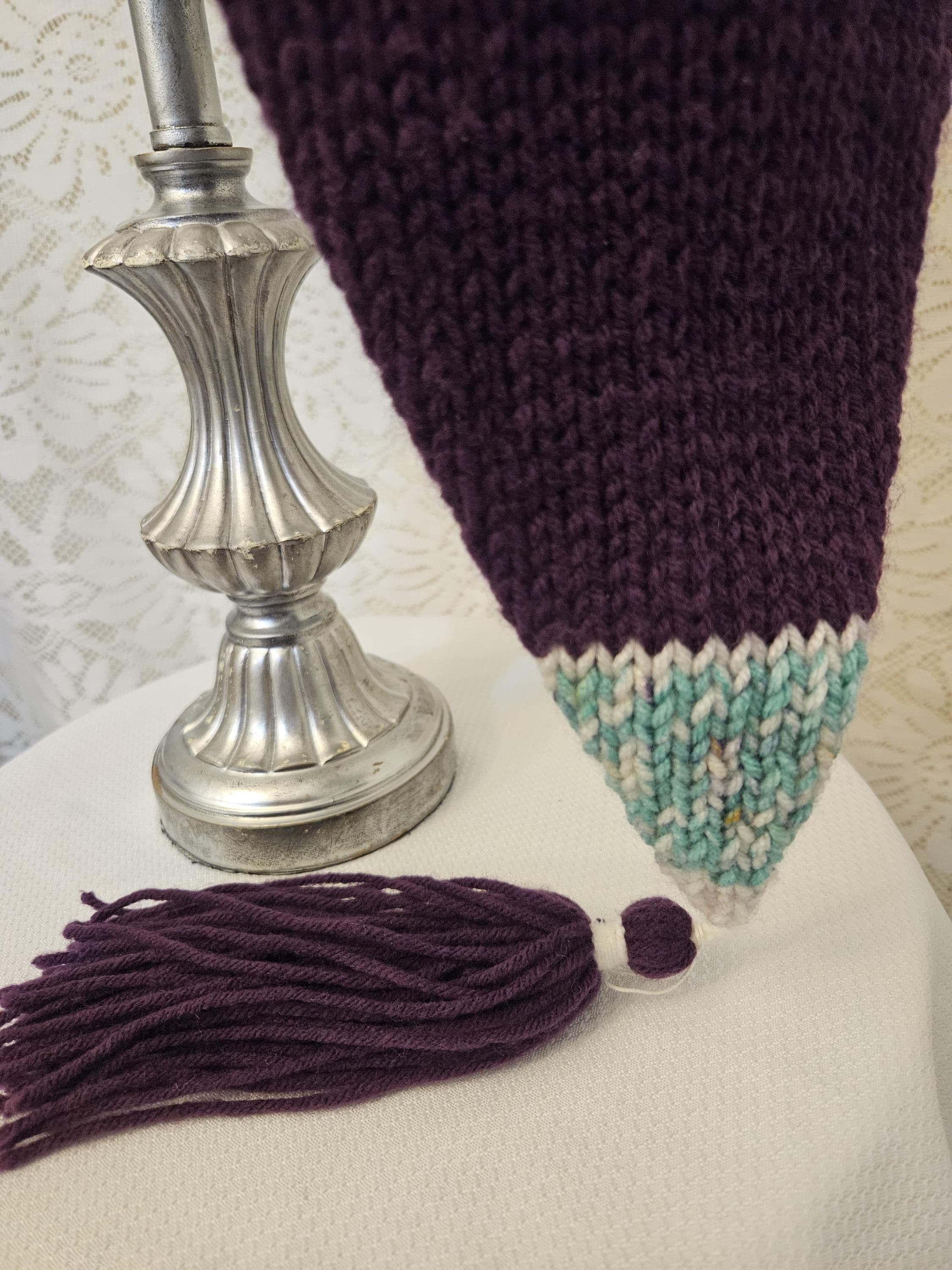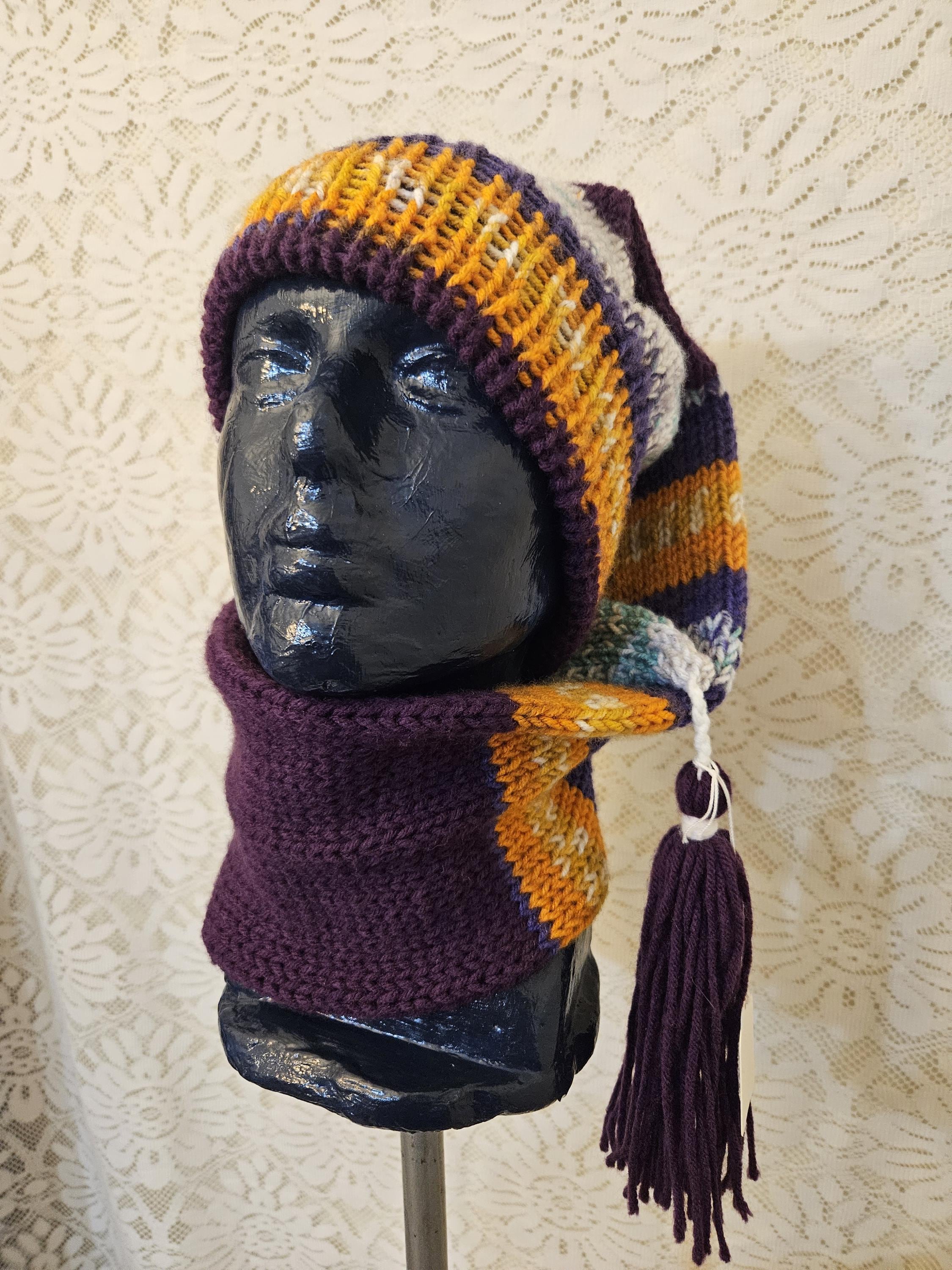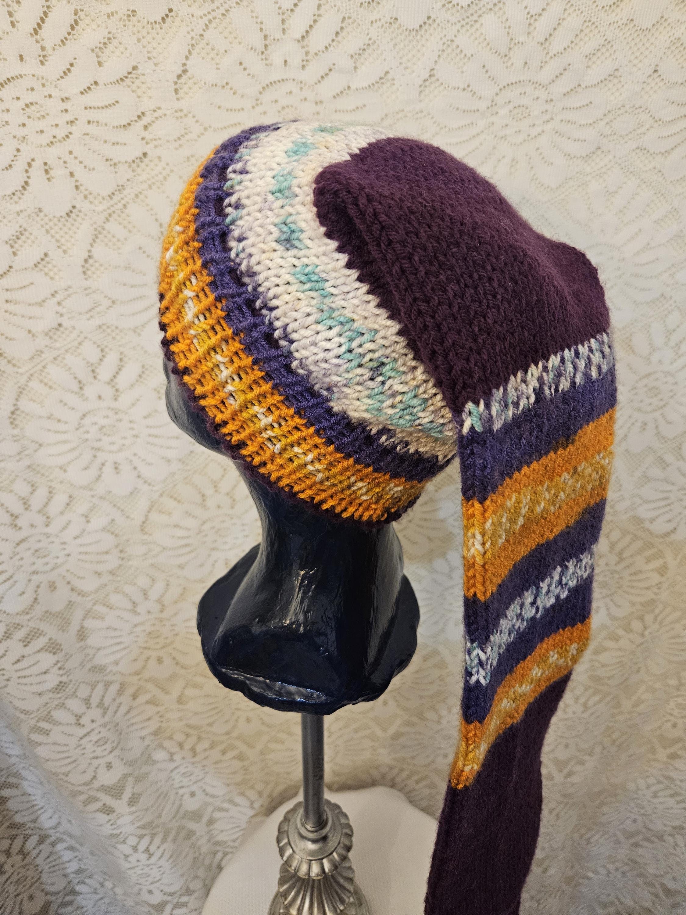 This is a pre-made long stocking hat made for man or woman. The Main color is dark orchard with white, orange, purple and matching tassel