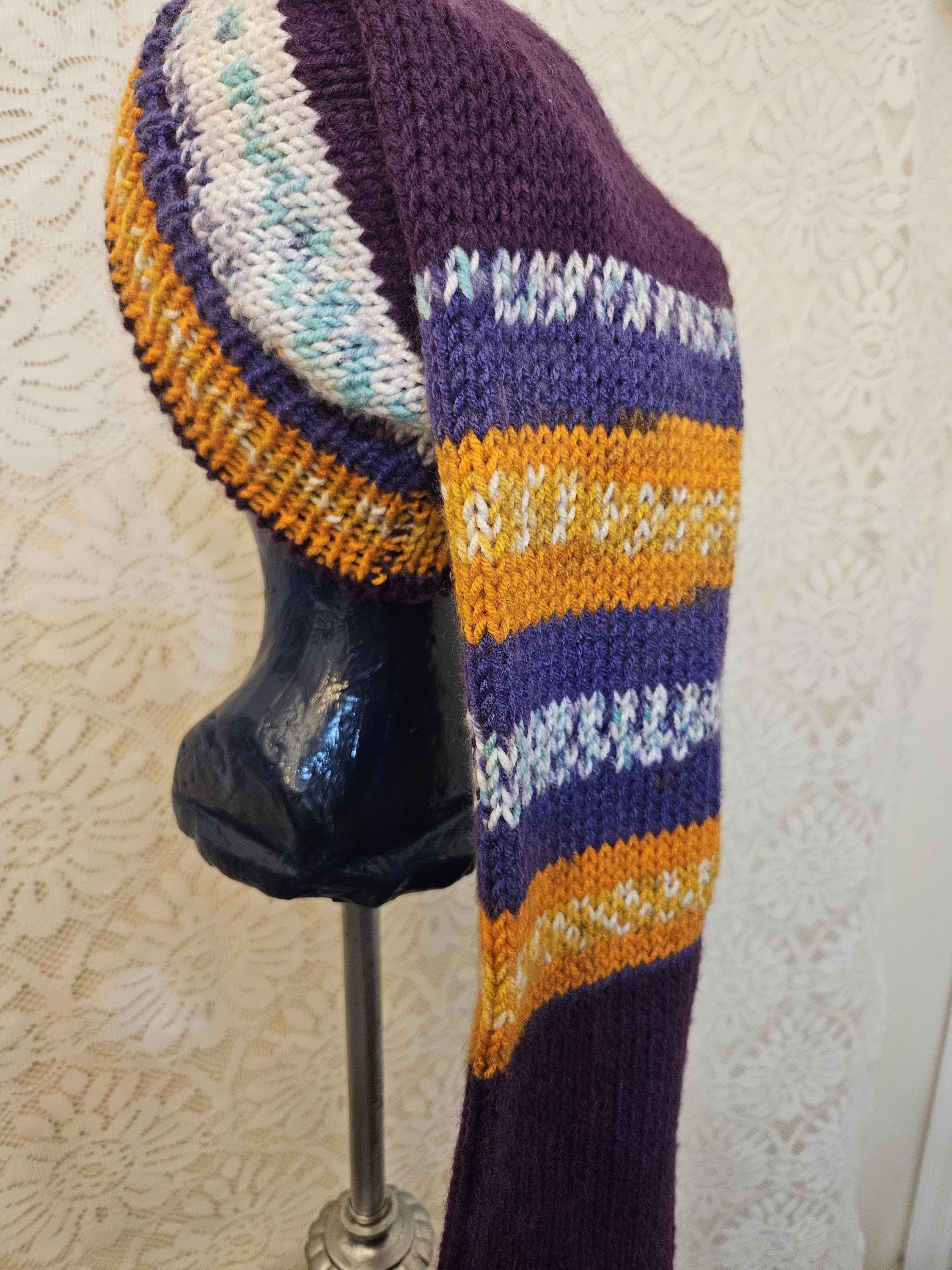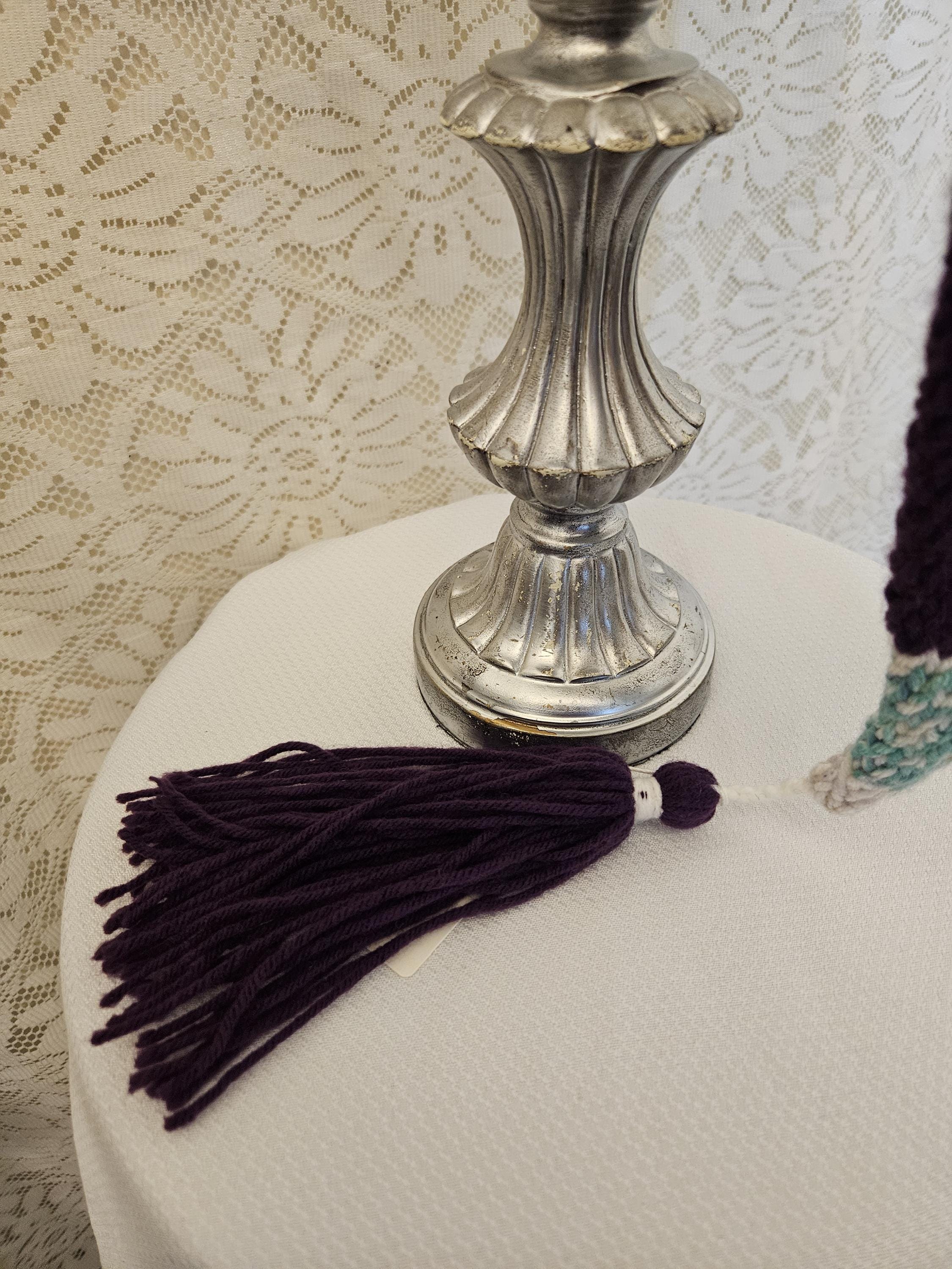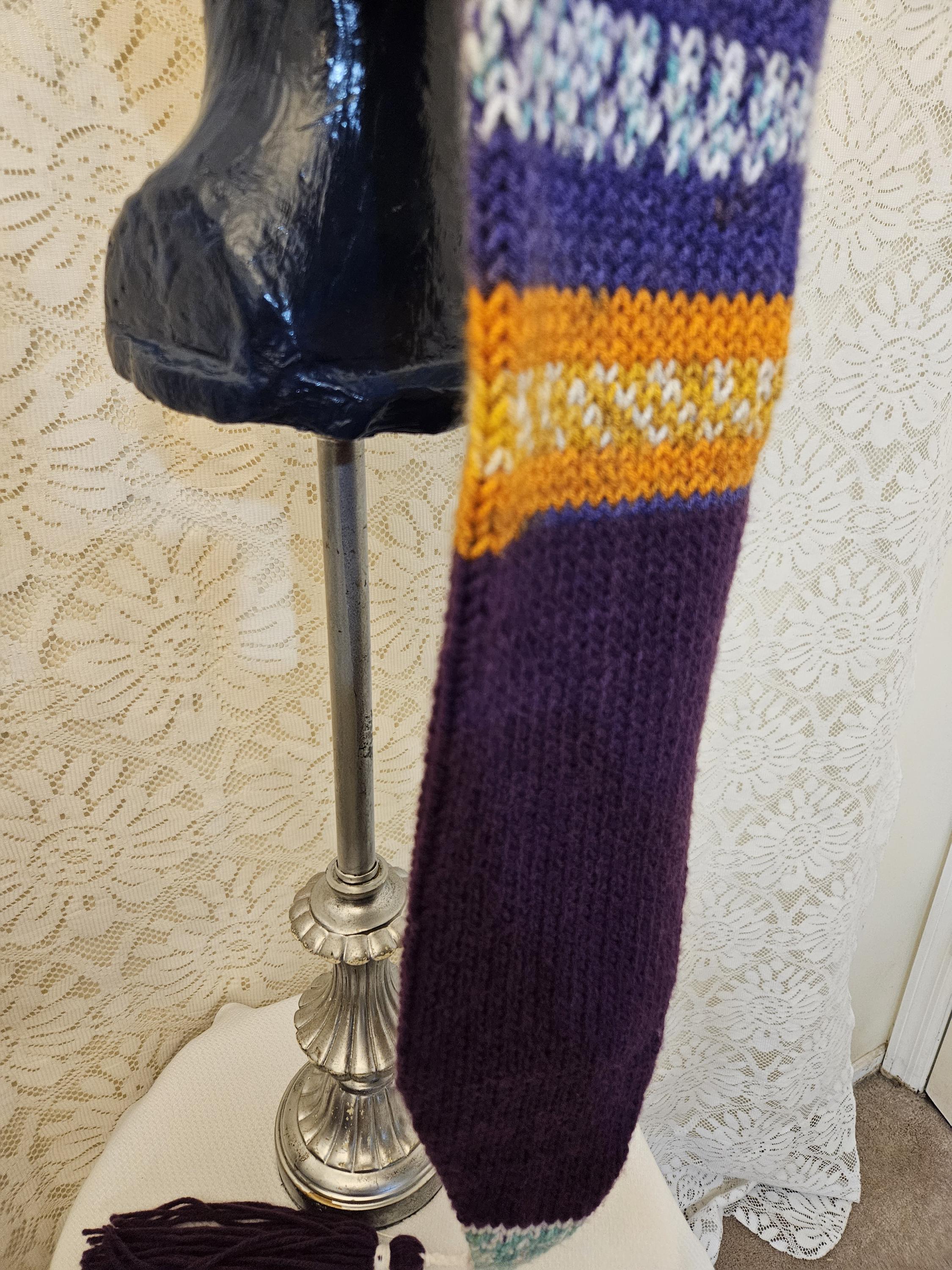 This is a pre-made long stocking hat made for man or woman. The Main color is dark orchard with white, orange, purple and matching tassel