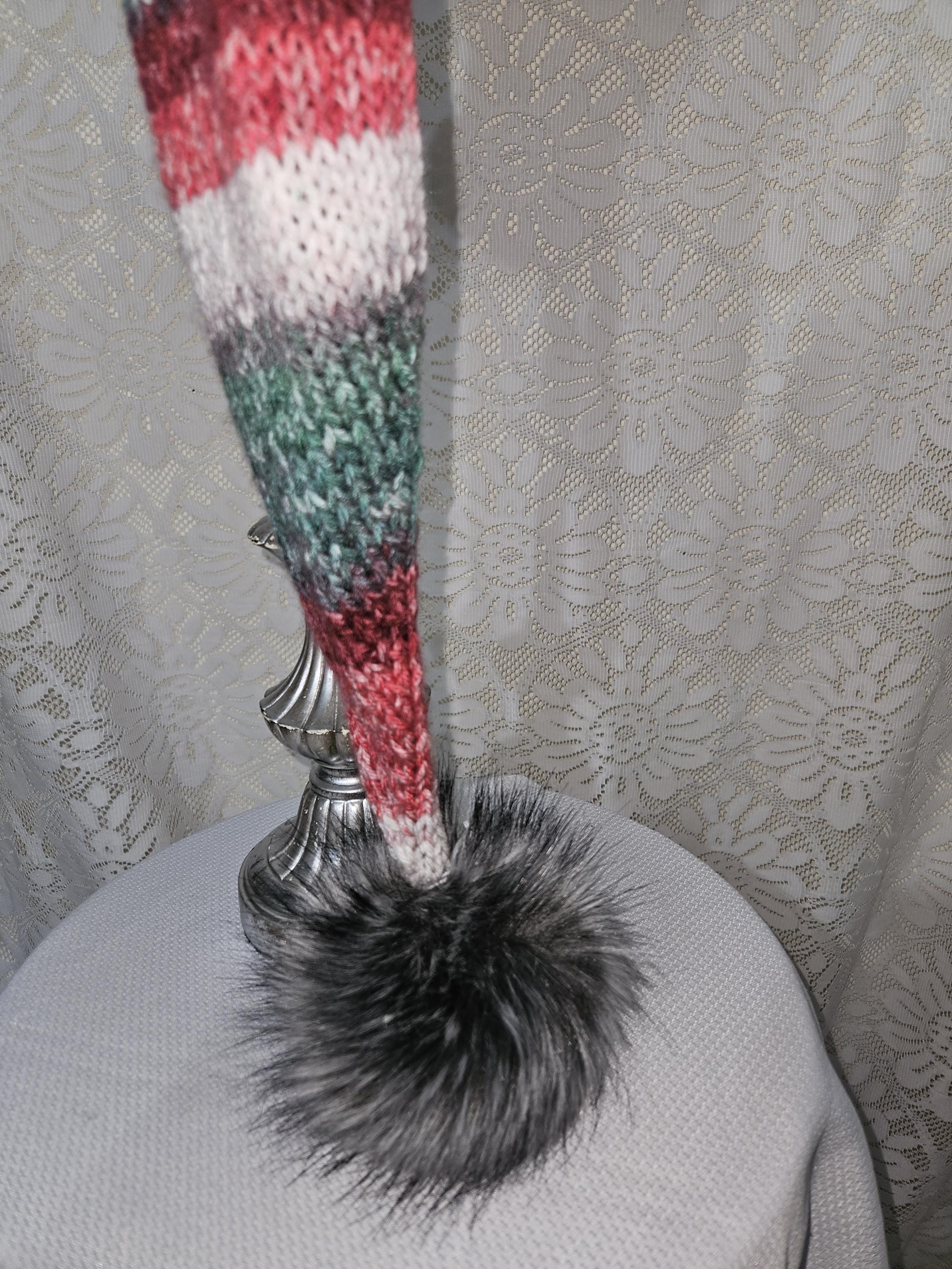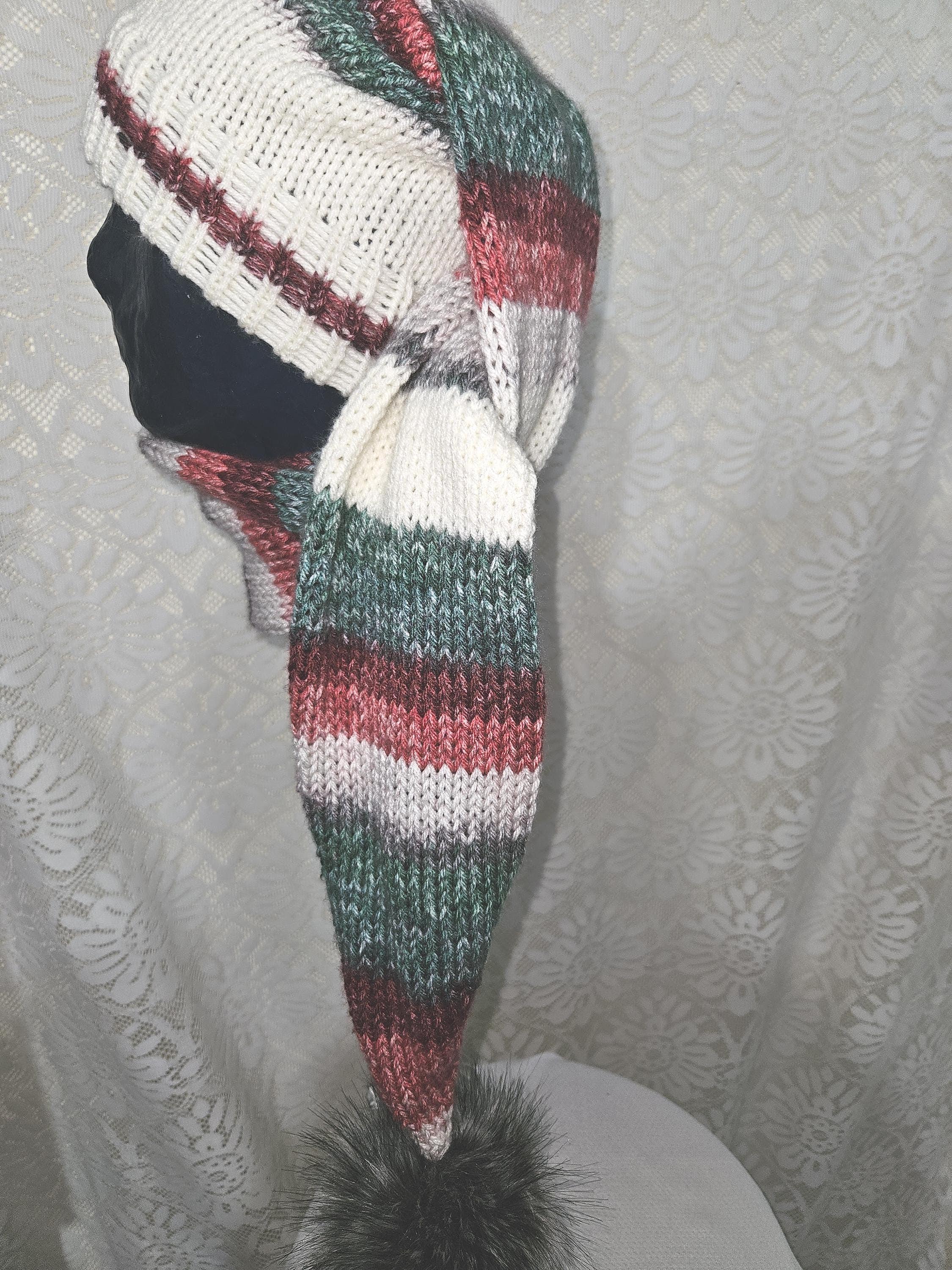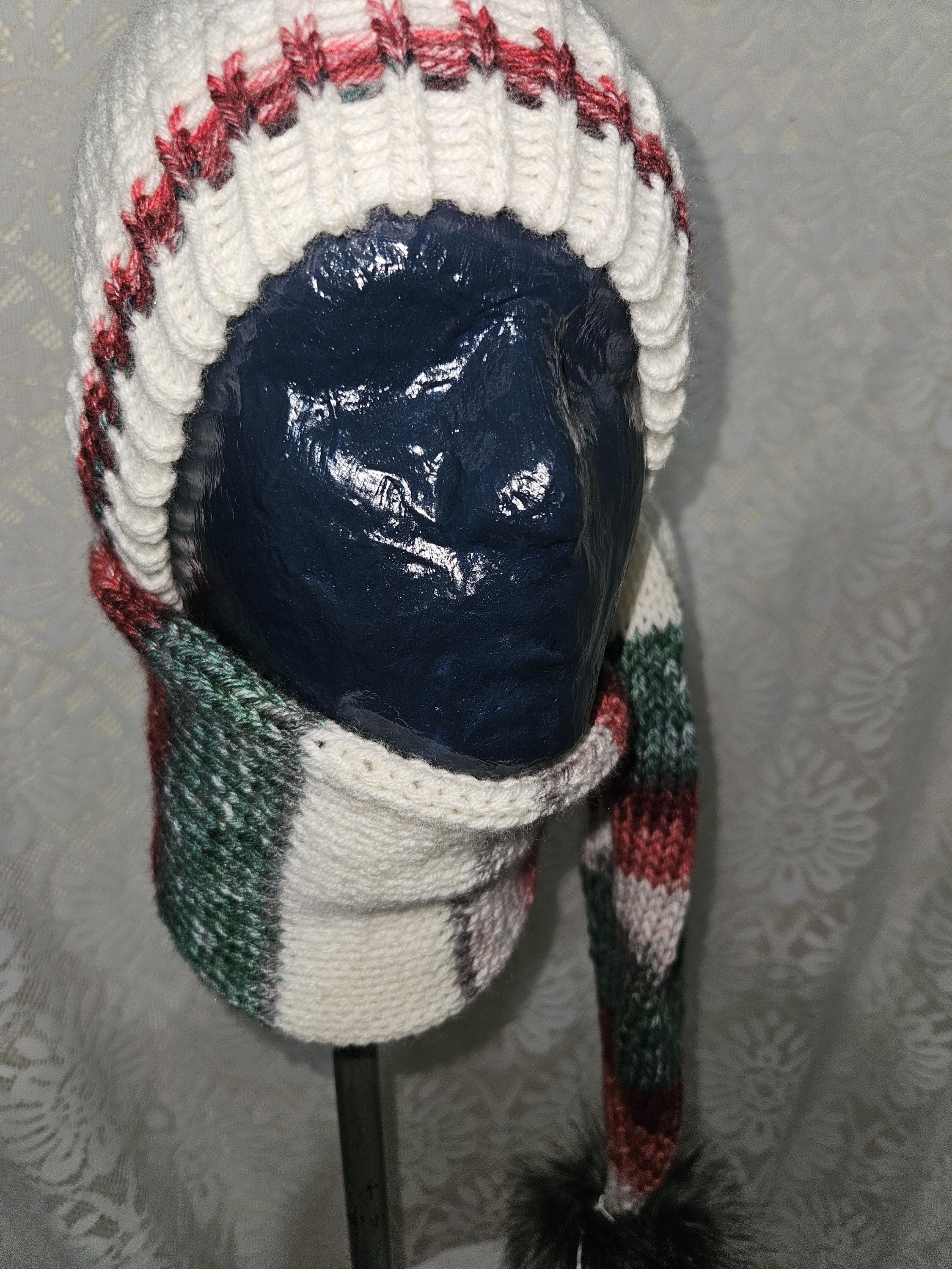 The Color is Ivory with yuletide (deep red and green) length is 54" and matching fur pom pom