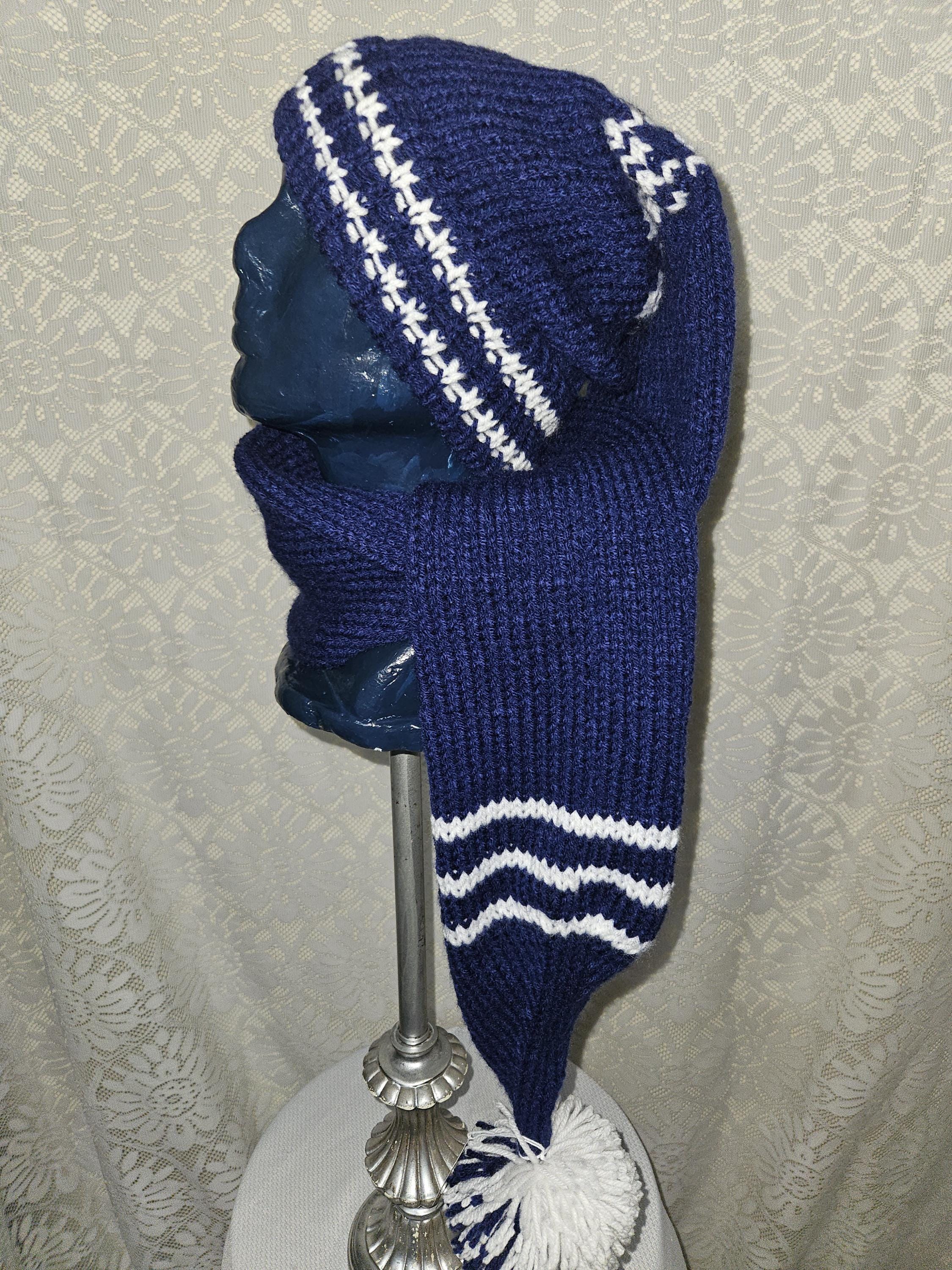 The Color is Navy blue with White design length is 55" and matching fur pom-pom