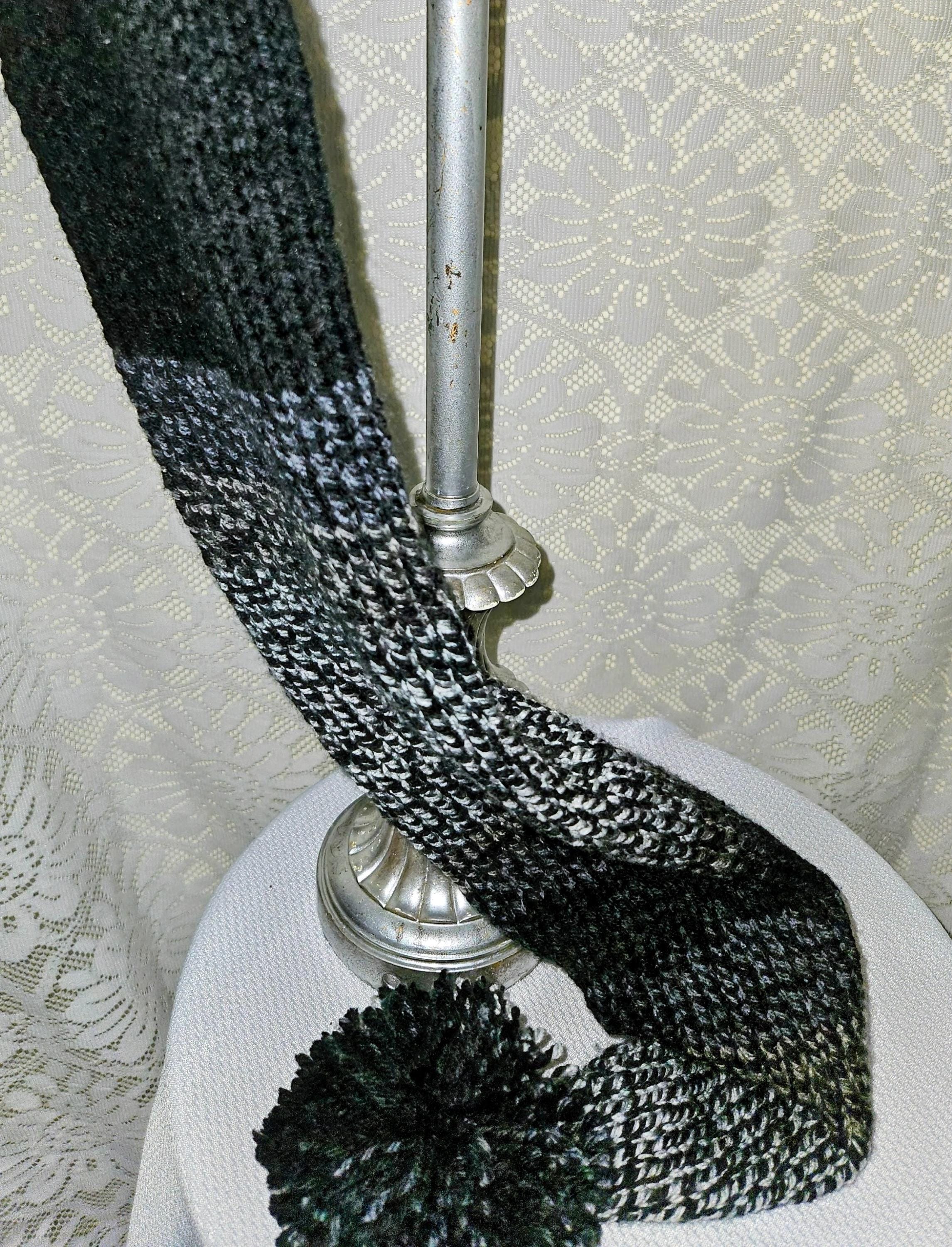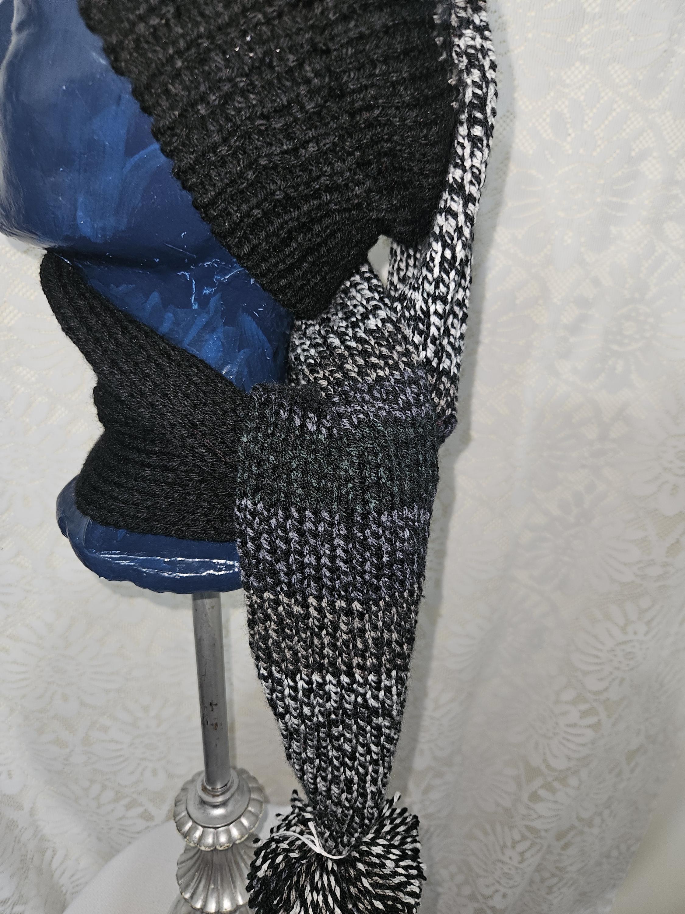 The Color is black with Black grey mix length is 48" and matching pom-pom