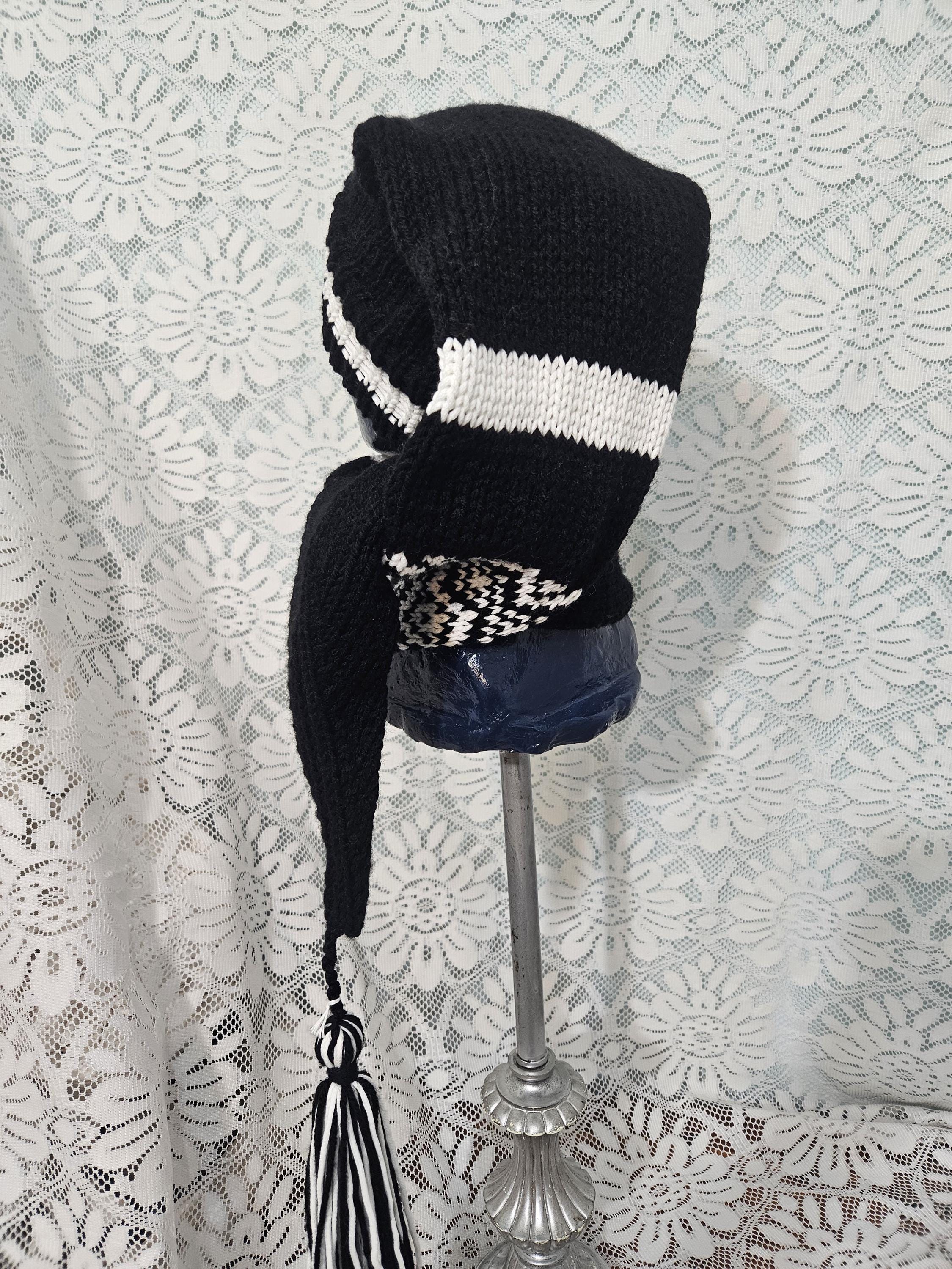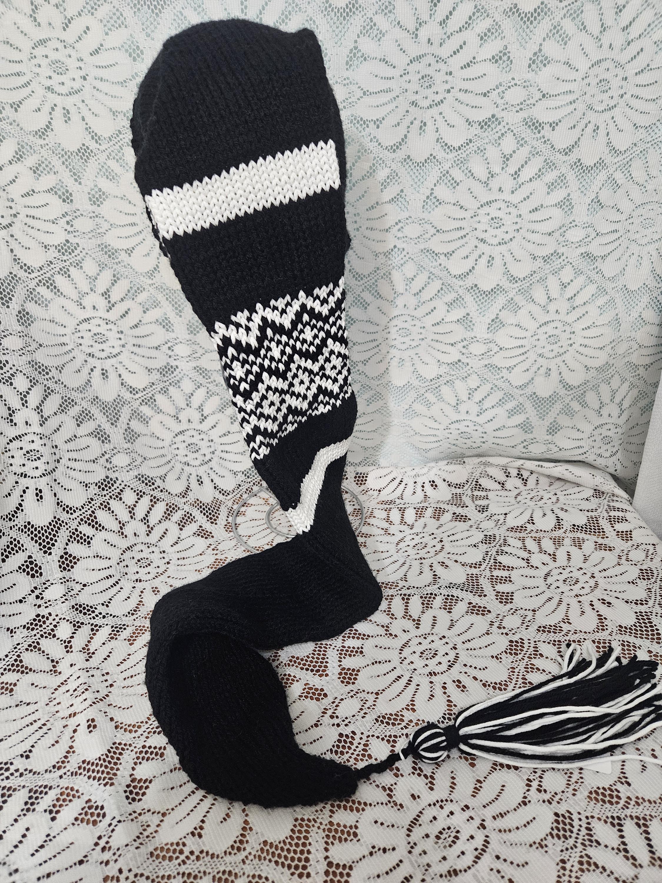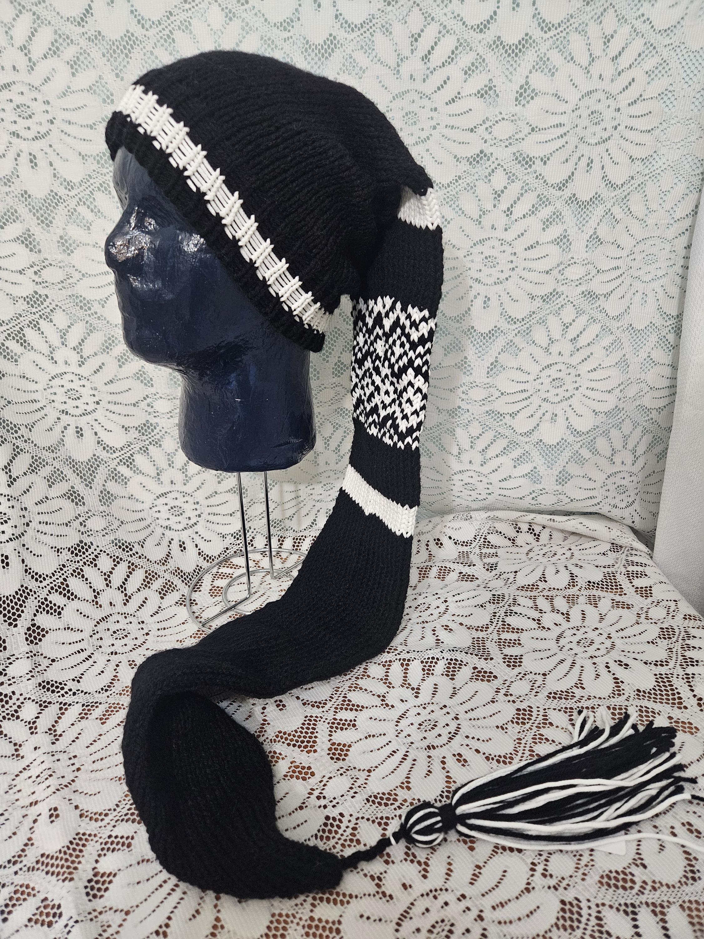 This is a pre-made hat made for Man or woman. The main color is Black with White glow in the dark yarn