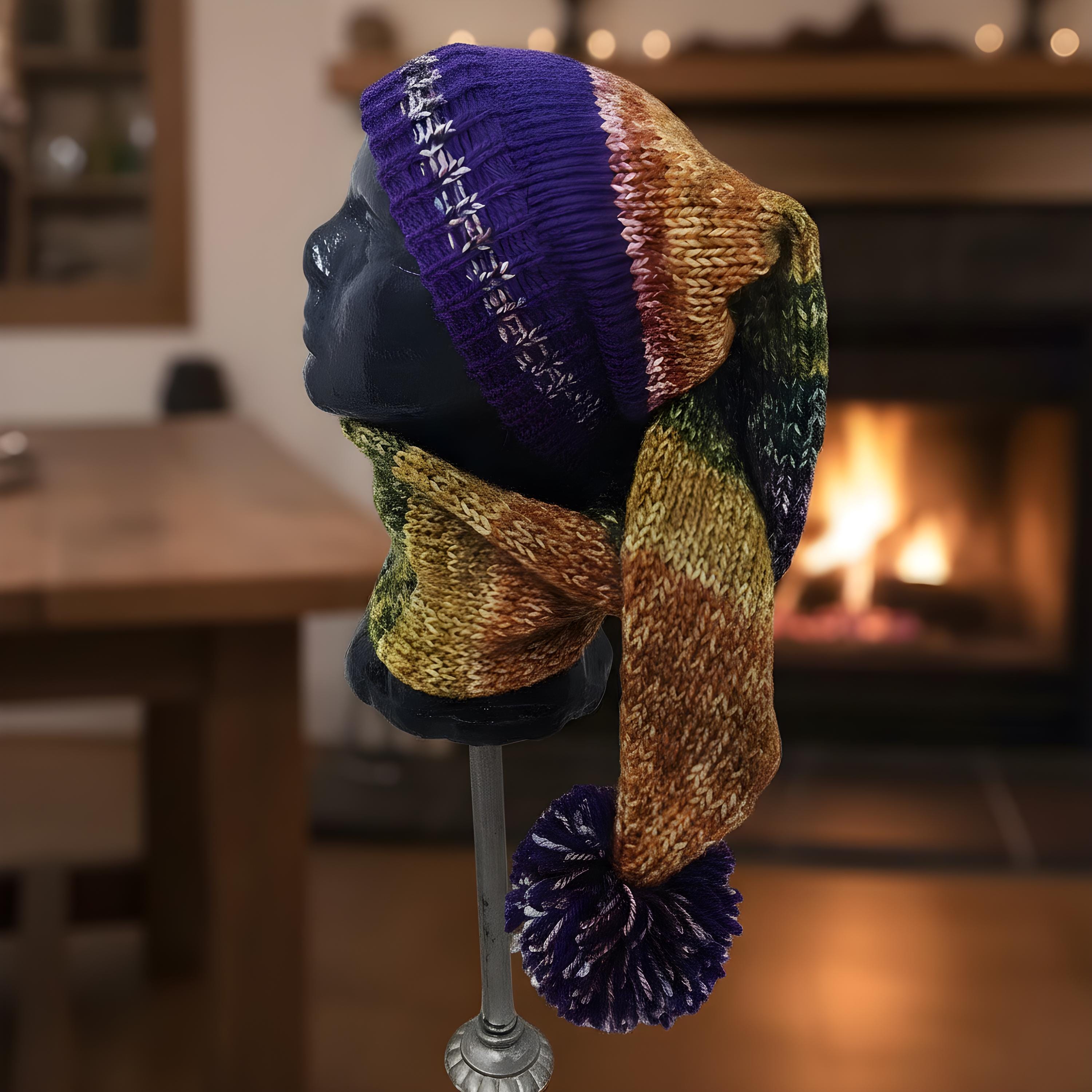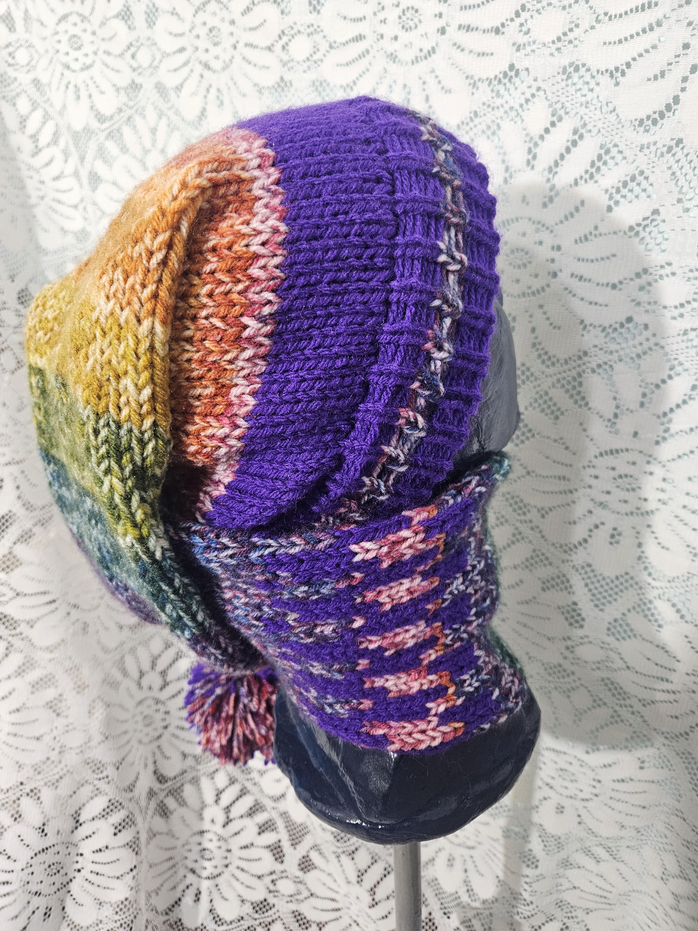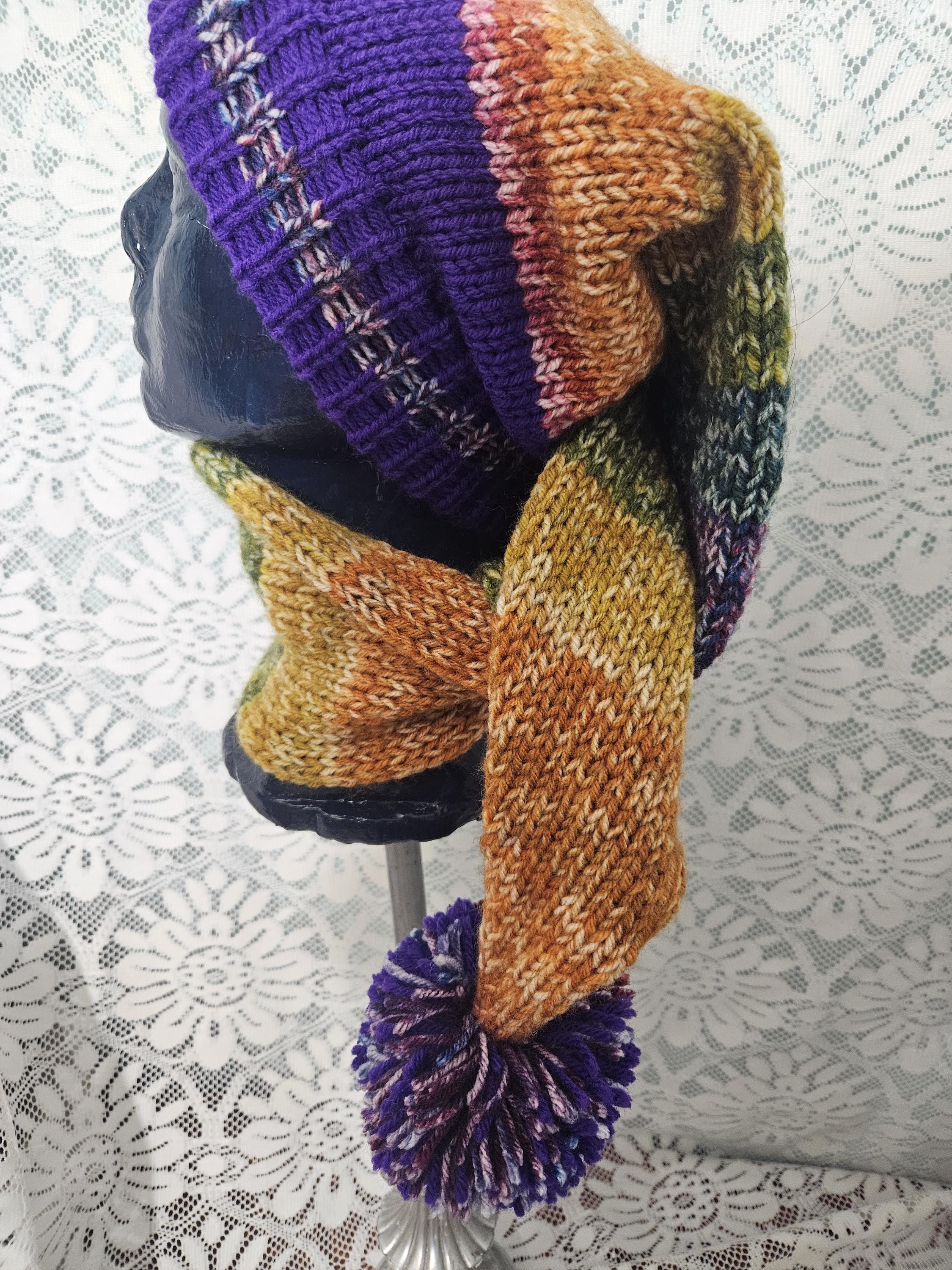 This is a pre-made long stocking hat made for man or woman. The Main color is Purple with Crayon box (a mix of red, yellow, green, orange and purple)
