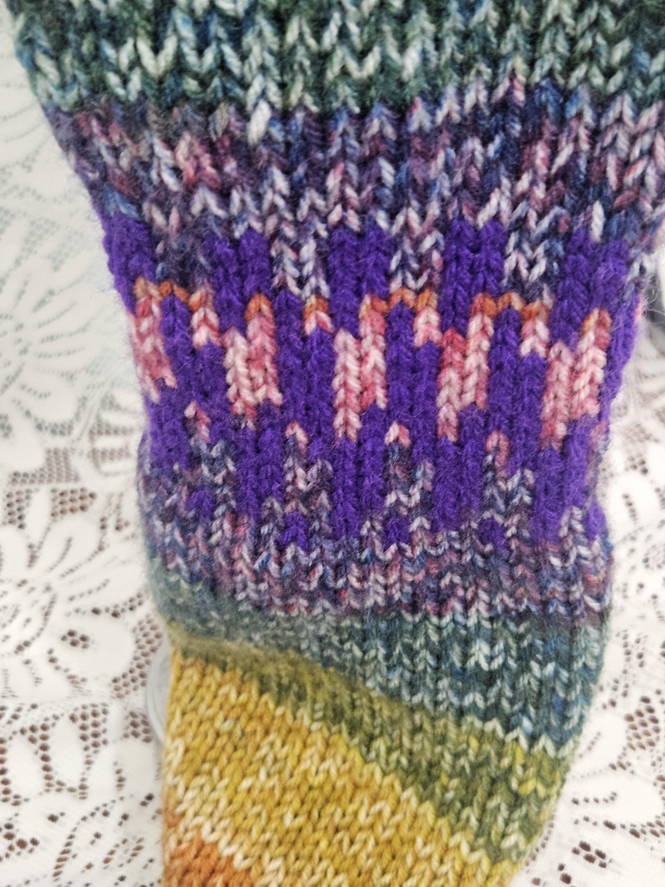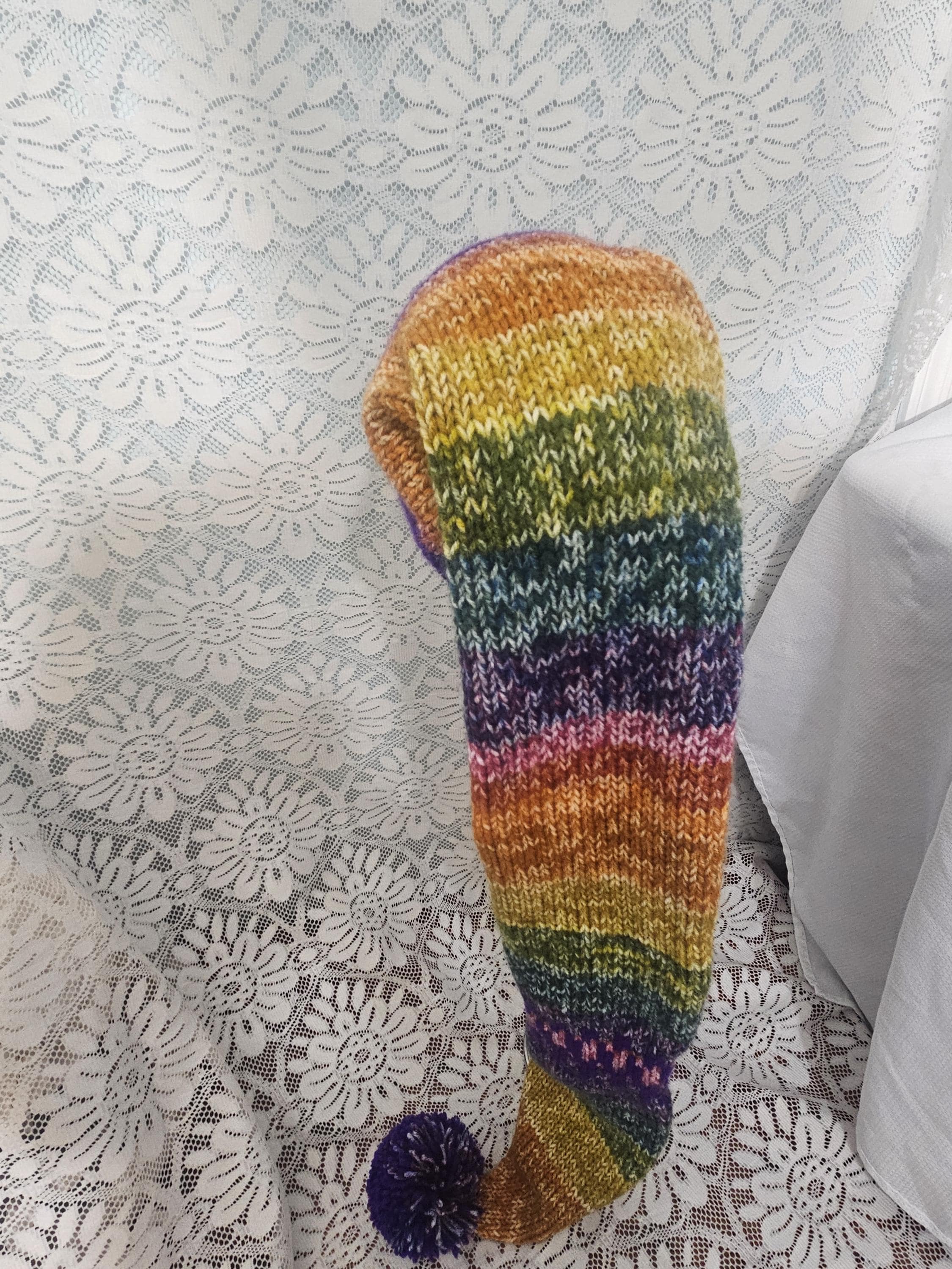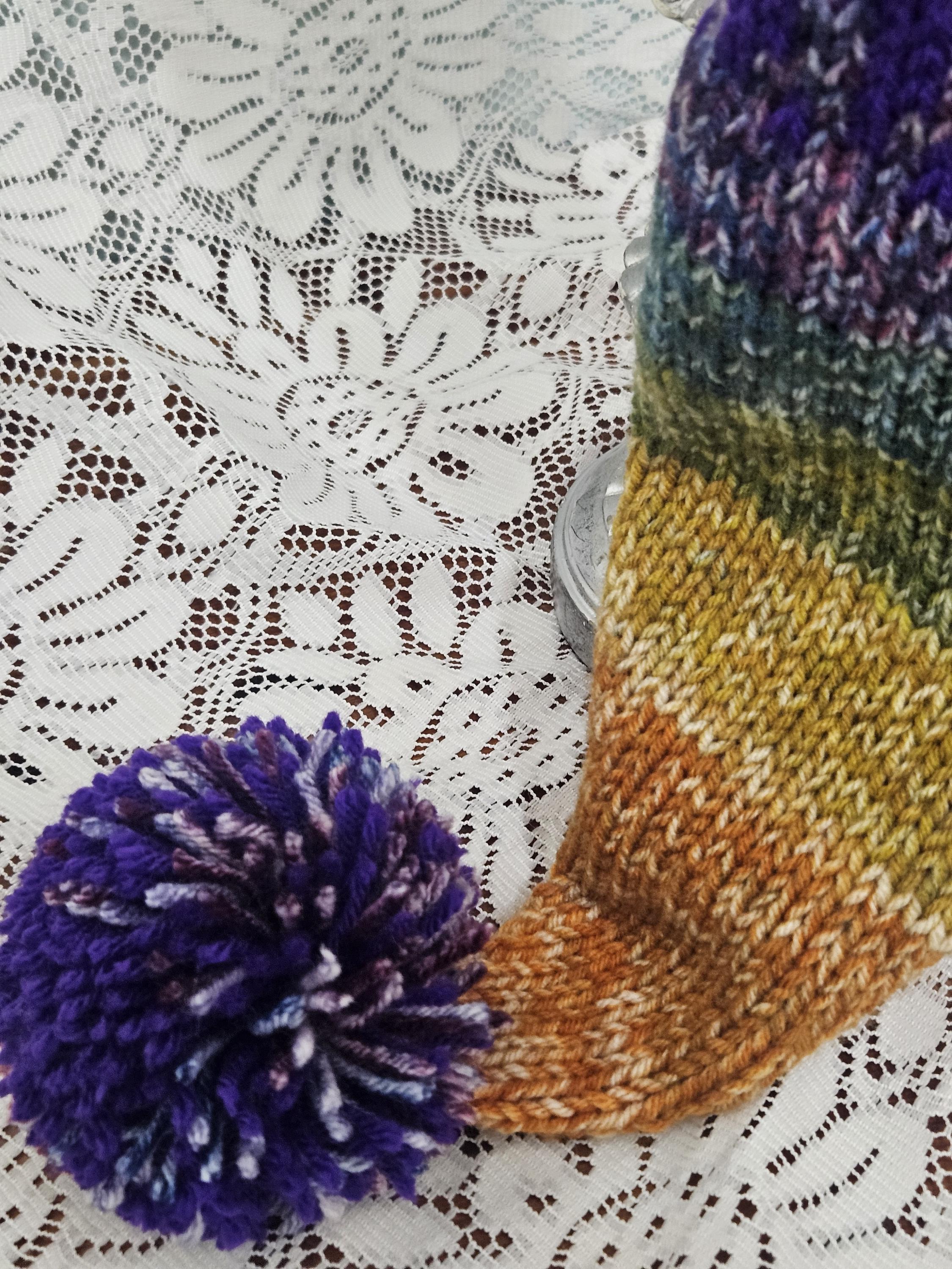 This is a pre-made long stocking hat made for man or woman. The Main color is Purple with Crayon box (a mix of red, yellow, green, orange and purple)