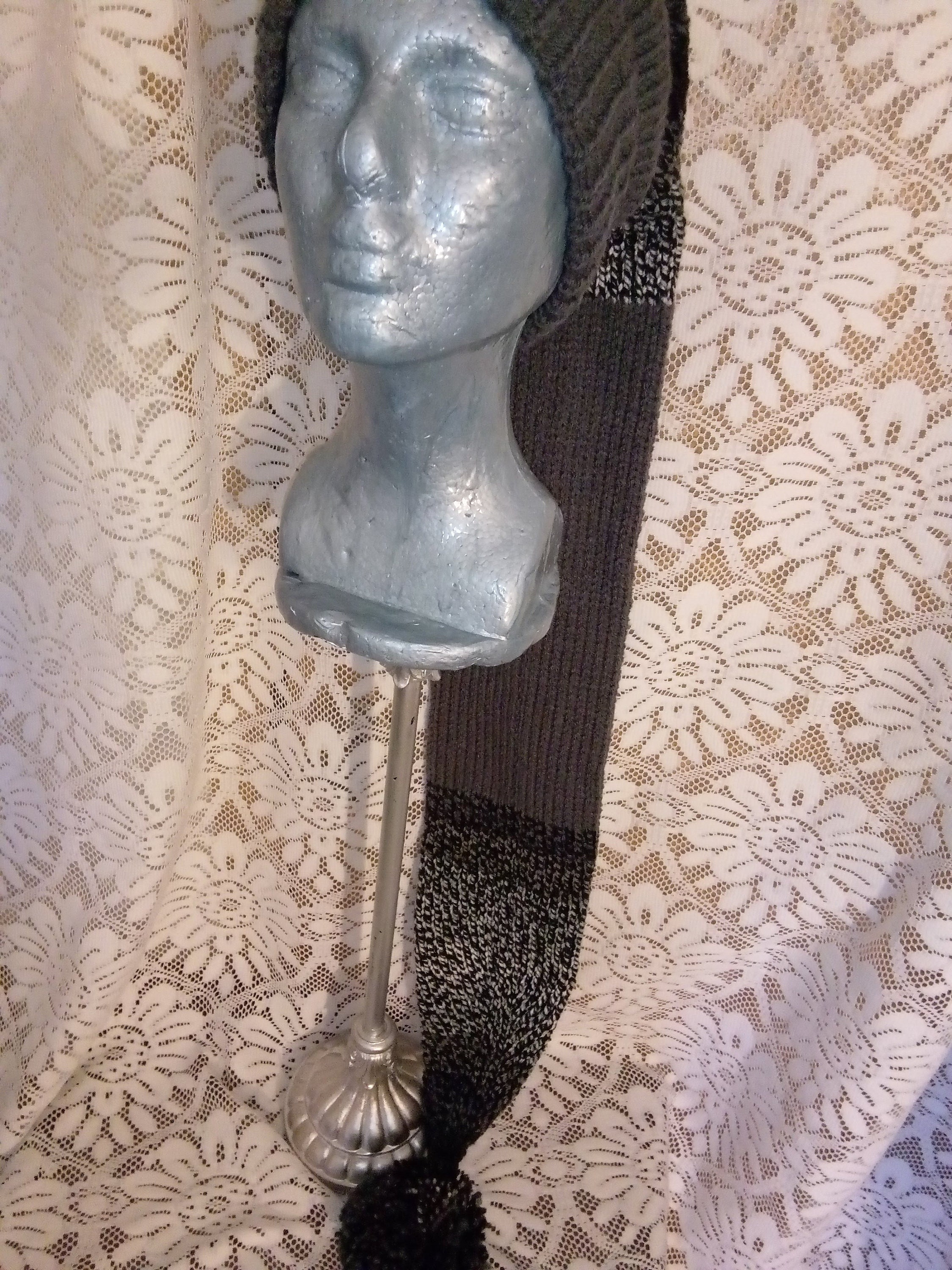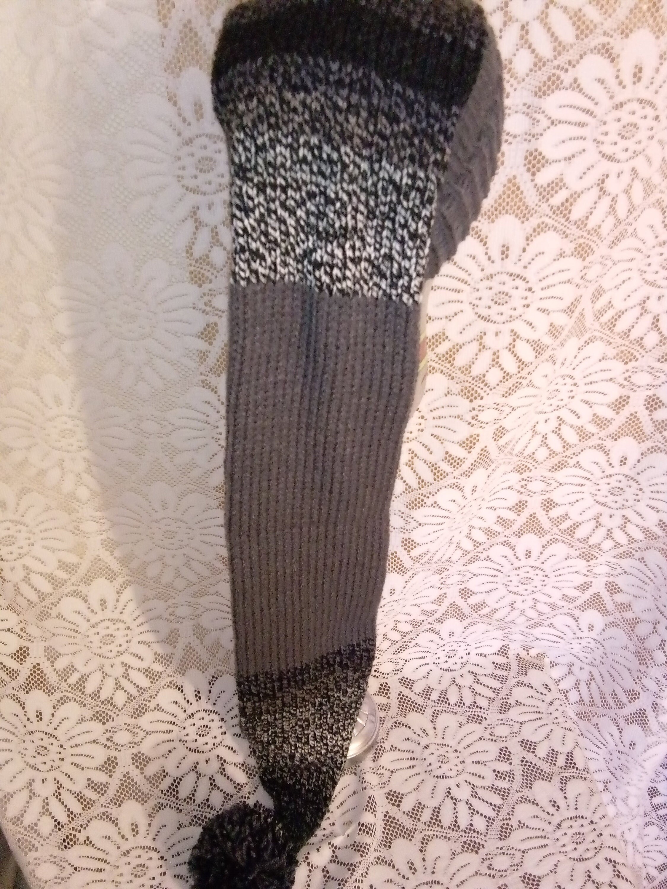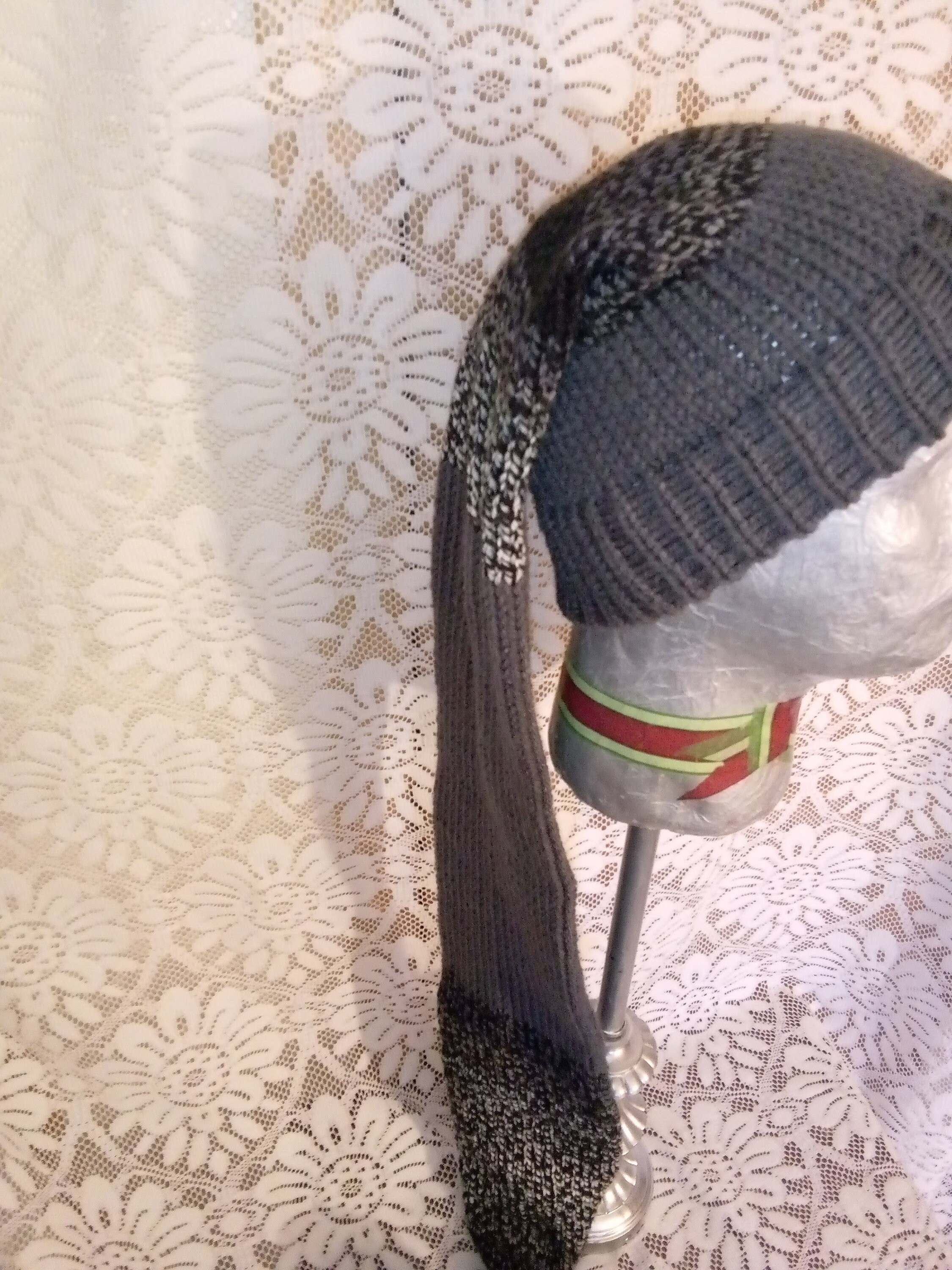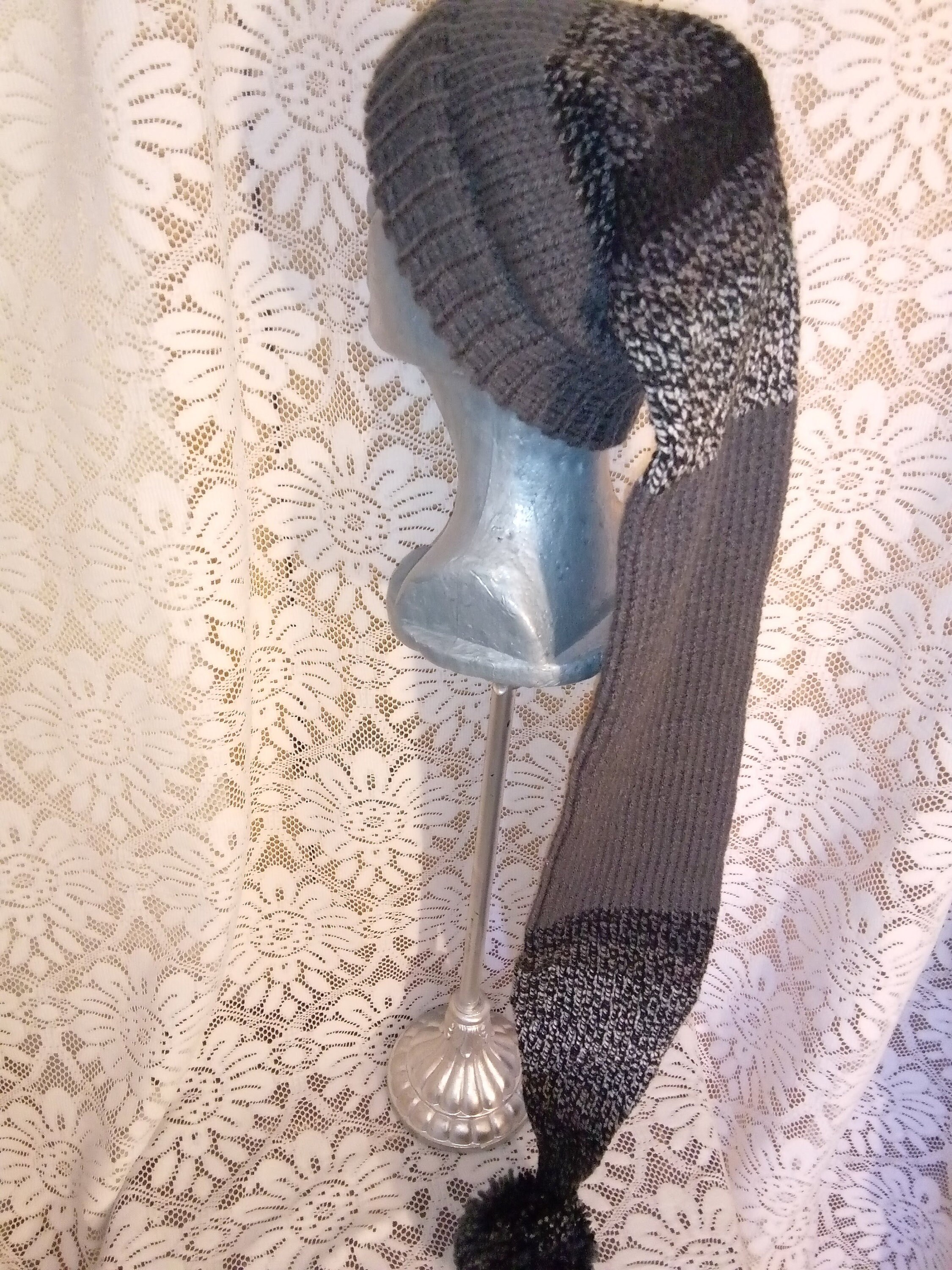 The length is 42" with a matching pom-pom. The Main color is Charcoal gray and Black mix.